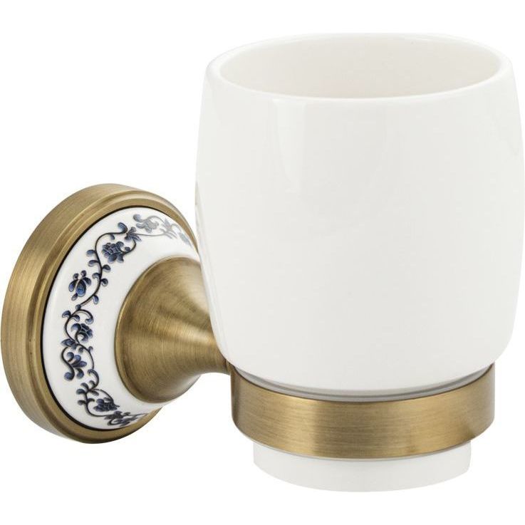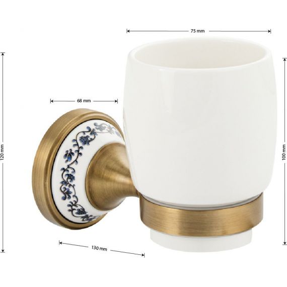 Стакан керамический с креплением к стене, правильной формы, на металлическом основании, с керамической вставкой с орнаментом. Изделие выполнено из белой керамики и металла. Материал изготовления — ЦАМ. Имеет специальное бронзовое, матовое покрытие, которое защищает изделие от влаги и придает ему безупречный стильный вид и долговечность. Идеально подойдет не только для ванной, но и для кухни. Изделие крепится к стене с помощью дюбелей и саморезов (входят в комплект). Габаритные размеры: высота 120 мм, диаметр 68 мм, глубина 130 мм, высота стакана 100 мм, диаметр стакана 75 мм. Вес - 0,54 кг, объём - 0,00166 м3.