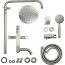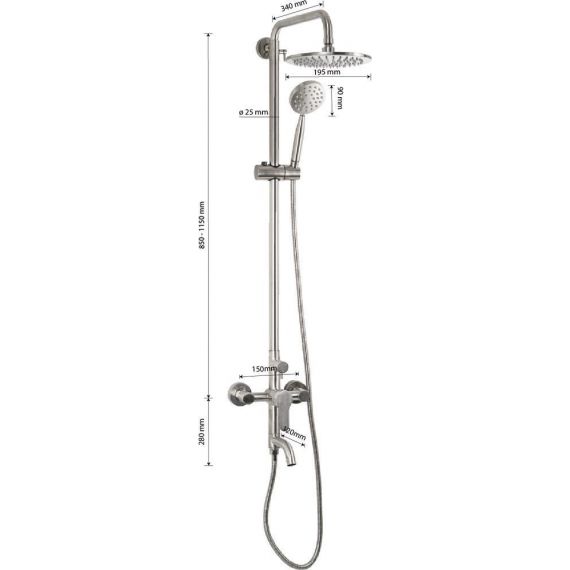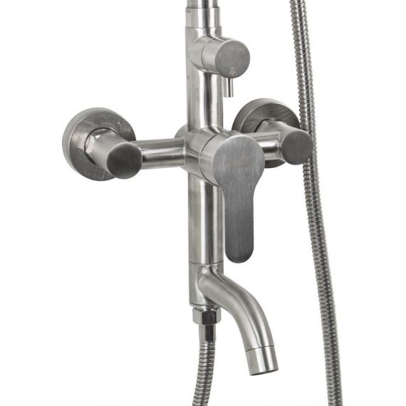 Смеситель + стойка душевая "тропический душ" с двумя лейками в ванную / душевую комнату, матовая, из нержавеющей стали марки 304. Смеситель шаровый, прямой корпус с коротким поворотным изливом, душевым шлангом и лейкой, дивертор переключения в трёх положениях. Картридж d = 35 мм, ручка литая, аэратор для экономии воды, чашки и эксцентрики. Душевая стойка с присоединением к корпусу смесителя и дополнительным креплением к стене и большой круглой лейкой с эффектом тропического душа. Габаритные размеры: ширина смесителя 150 мм, высота 280 мм, длина излива корпуса 120 мм, высота стойки 850 - 1150 мм, длина излива стойки 340 мм, круглая душевая лейка 90 мм, круглая лейка тропический душ 195 мм, шланг 150 см. Вес - 4,000 кг, объём - 0,0333 м3. В комплекте корпус с изливом, чашки, эксцентрики, прокладки, стойка, дивертор, шланг, две лейки, крепления.