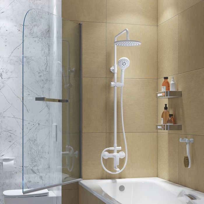 Смеситель для ванны с верхним душем и изливом, однозахватный, латунь, белый матовый, керамический картридж 35 мм, силиконовый аэратор; верхняя лейка из ABS-пластика, диаметр 225 мм, с белым лицом; ручная лейка из ABS-пластика, 110 мм, с белым лицом, 3 режима, держатель для ручной лейки - ABS-пластик; 3-х режимный керамический дивертор; шланг в металлической оплетке 1,5 м; штанга для душа - нержавеющая сталь с возможностью регулировки по высоте. Упаковка: картонная коробка.