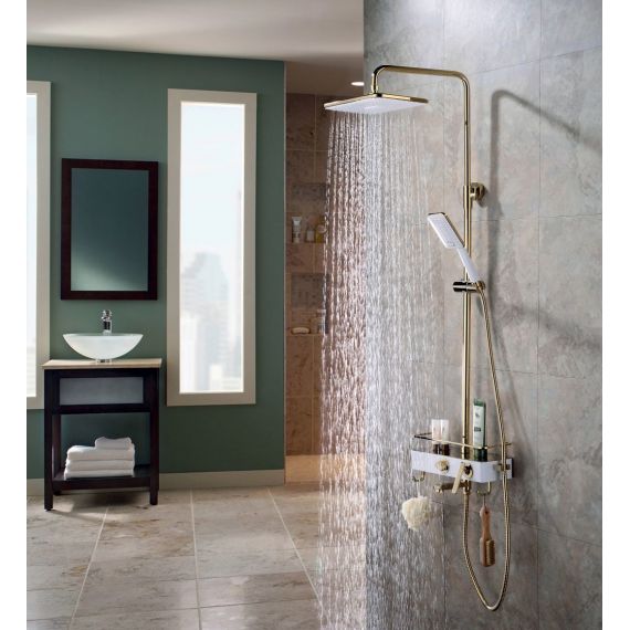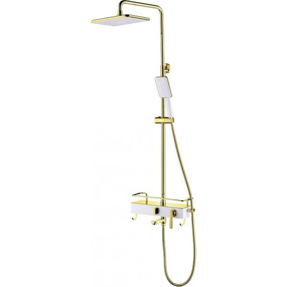 Душевая система для ванны Lemark Mista LM6462WG с поворотным изливом, полочкой, крючками, ручной душ 3 режима, шланг - 1.5 м, материал - латунь, цвет - белый/золото.