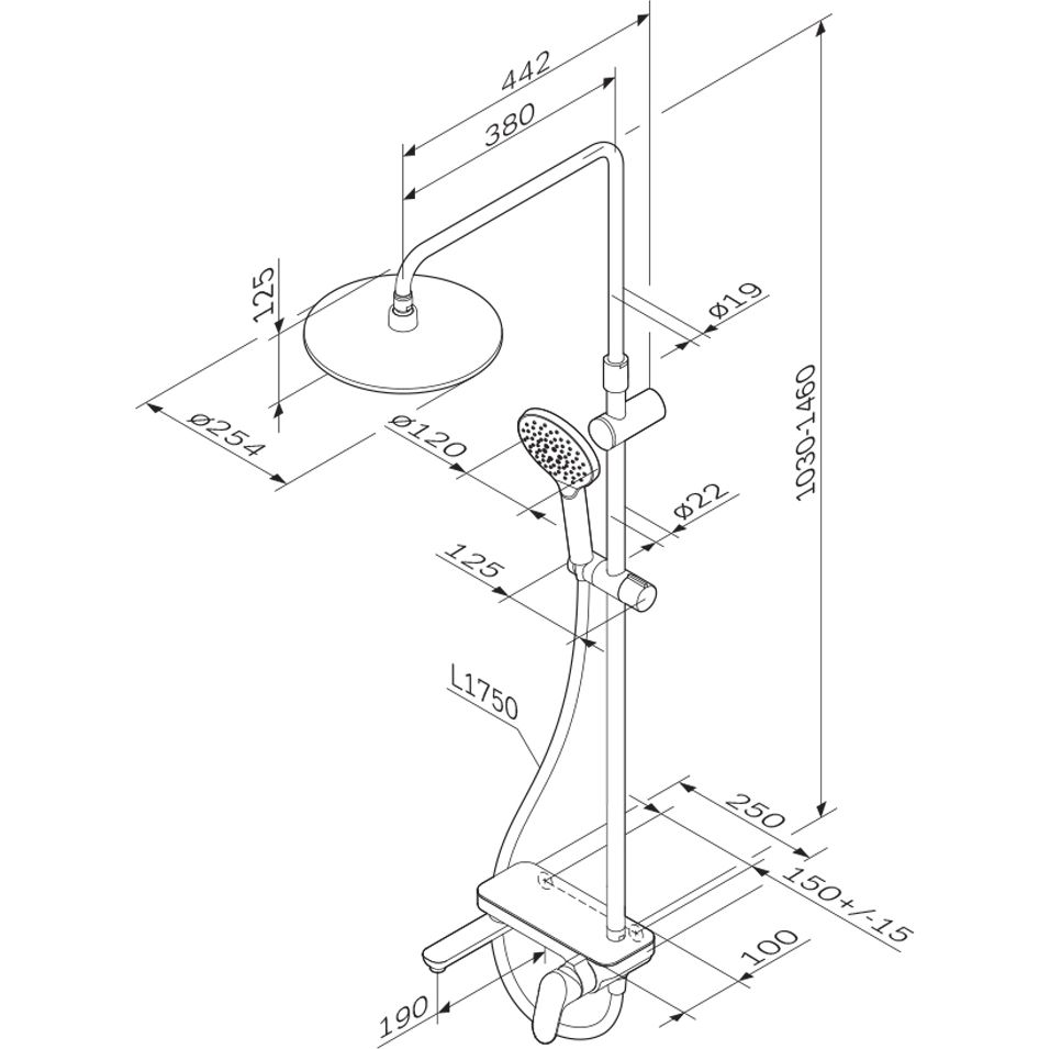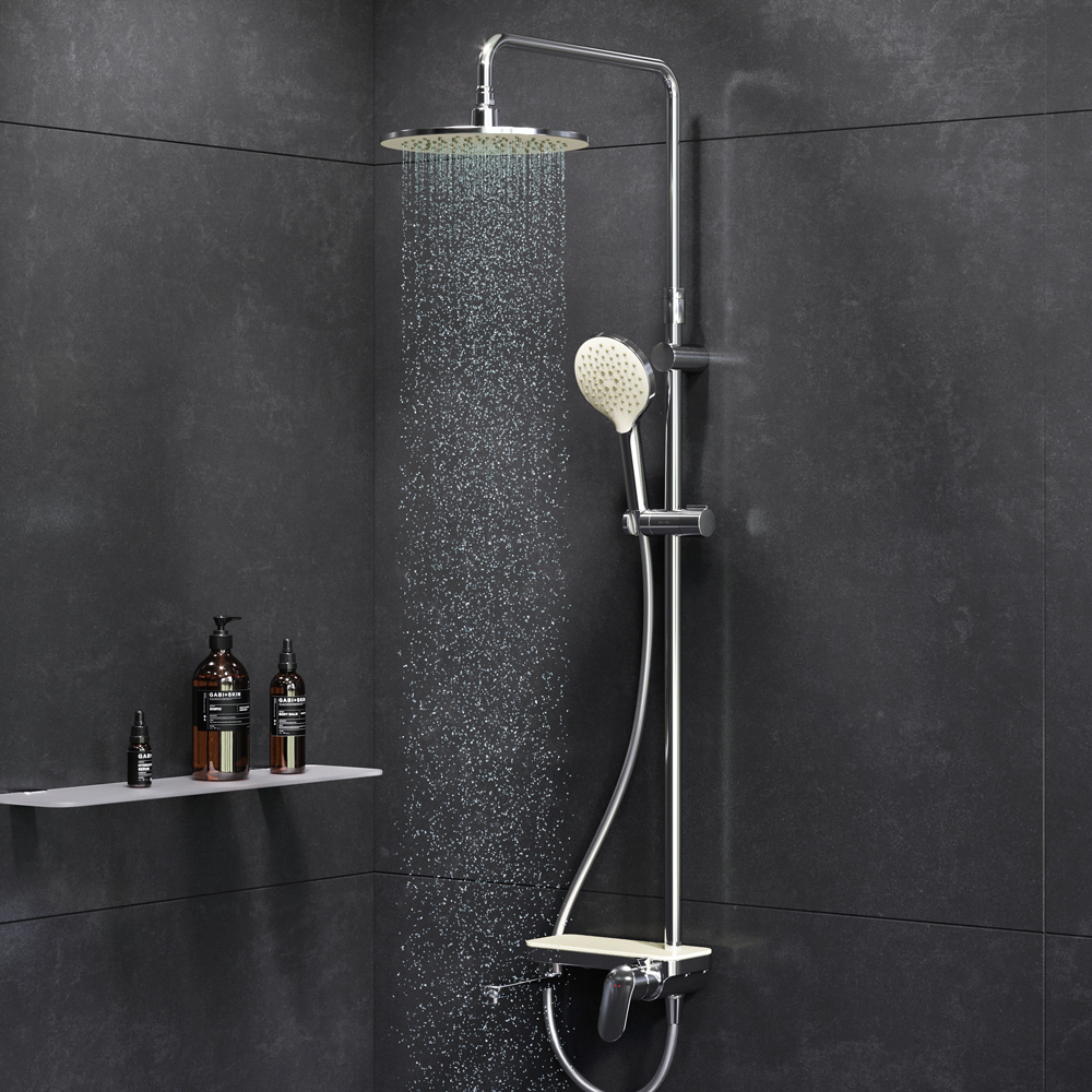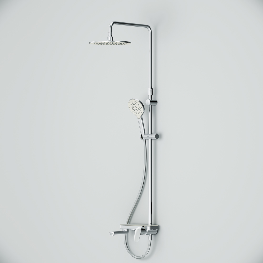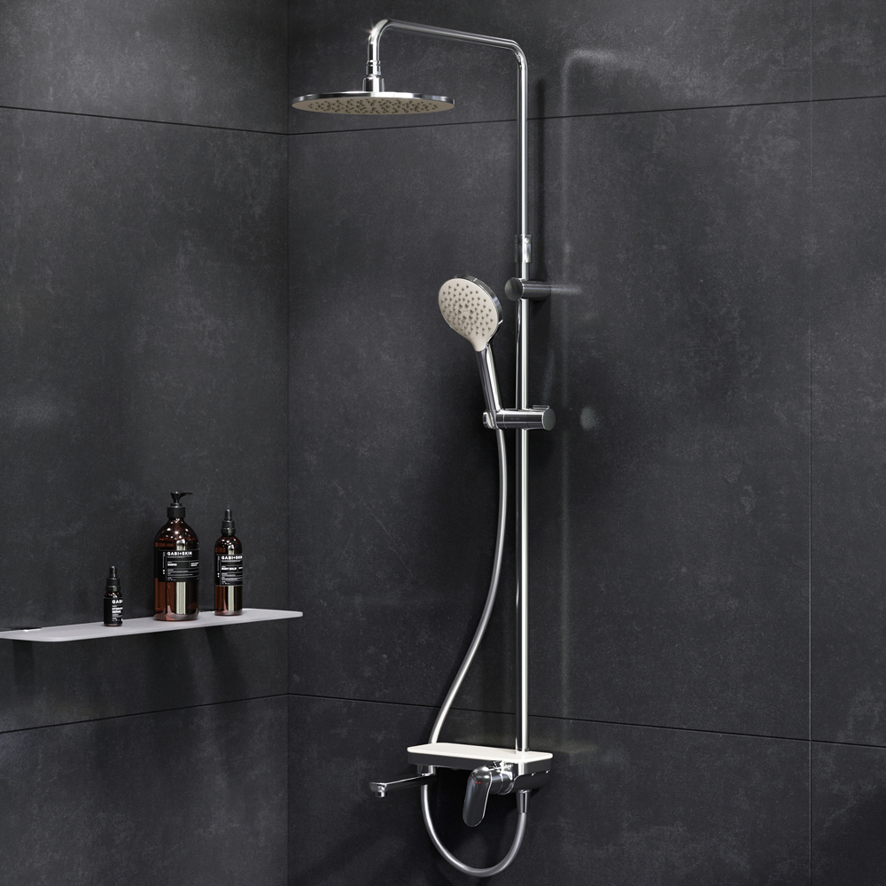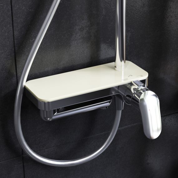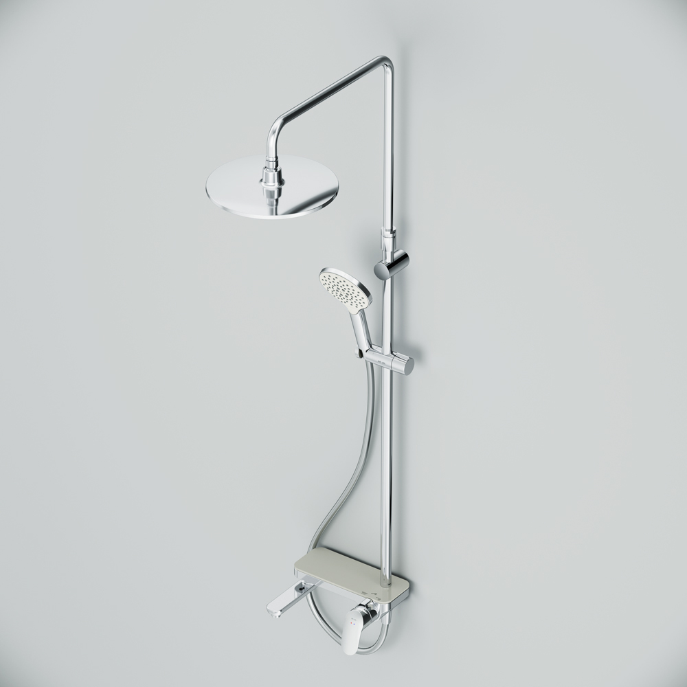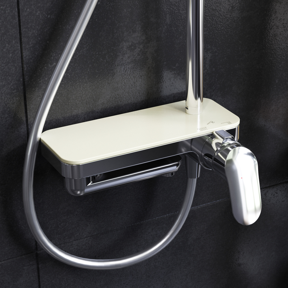 Тотальный дизайн в действии: все детали душевой системы – от пропорций ручного и верхнего душей до рисунка расположения форсунок на лейках. Премиальные размеры и продуманные детали: увеличенный диаметр душевых леек (верхний душ 254 мм и ручной душ 120 мм) позволит ощутить преимущества тропического душа тогда как увеличенная длина шланга 1750 мм обеспечит свободу движений во время принятия душа. Телескопическая поворотная штанга регулируется по высоте в диапазоне от 1030 до 1460 мм обеспечивая комфорт для людей любого роста а шаровой шарнир в держателе верхнего душа позволяет регулировать угол его наклона. Смеситель выполнен в виде полочки. Чистый дизайн без лишних деталей: переключатель расположен за ручкой настройки температуры и позволяет менять источник потока воды от ручной лейки и излива до верхнего душа.