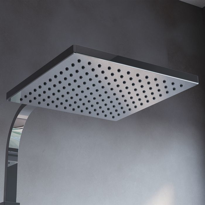 Душевой гарнитур Bild с верхним душем прямоугольной формы отличают выраженные геометрические формы и стильная хромированная лицевая поверхность лейки.