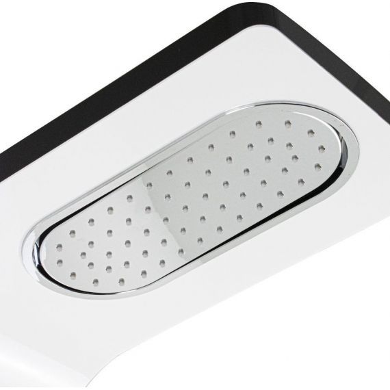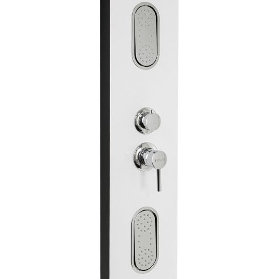 Ультрамодная дизайнерская, гидромассажная душевая панель - "тропический душ" с двумя лейками и форсунками, 3 режима работы. Функциональность обеспечивают тропический, верхний каскадный душ, ручная лейка и форсунки для массажа спины. Эффектный внешний вид и практичность эксплуатации придает изделию из нержавеющей стали марки 304 крашенная, белая с черным эмаль. Сочетание эстетики и максимального комфорта достигается за счет интегрированных гидромассажных форсунок и встроенного верхнего душа. Стильное и компактное оборудование предназначено для установки в ванну или любую душевую зону. Душевая панель позволит проводить оздоровительные процедуры в домашних условиях, гидромассажные форсунки окажут мягкое терапевтическое воздействие. Габаритные размеры: высота 1500 мм, ширина 220 мм, глубина 75 мм, длина верхнего душа 450 мм, длина шланга 150 см. Вес - 12,000 кг, объём - 0,16000 м3. Комплект: корпус / крепления / лейка 2 режима / держатель для лейки / душевой шланг / переключатель потоков / соеденительные шланги.