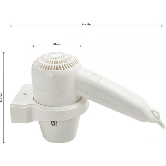 Фен для волос в ванную комнату с кольцевым креплением, предназначен для сушки волос потоком теплого воздуха. Идеально подходит для установки в гостиницах, бассейнах, фитнес-клубах, в раздевалках складских и производственных комплексов. Так же может использоваться в личных ванных комнатах. Электрический фен позволяет комфортно и быстро высушить волосы после душа. Настенный держатель дает возможность хранить электроприбор в ванной комнате. Материал корпуса выполнен из белого высокопрочного пластика АБС, устойчивого к механическим повреждениям, перепадам температуры и коррозии. Поэтому электроприбор подходит не только для домашнего, но и для общественного использования – бассейны, сауны, душевые в спортивных залах. Благодаря небольшому весу феном удобно пользоваться. Параметры: 1300W, 220В, 2 скорости. Скорость потока 17 м/с. Габаритные размеры: длина 230 мм, высота 135 мм, диаметр фена 70 мм, длина шнура розетки 800 мм, длина пружинного шнура 380 - 600 мм. Вес - 0,700 кг, объем - 0,00503 м3.
