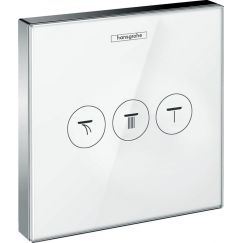 Переключатель потоков на три потребителя Hansgrohe Shower Select 15736400, материал белой накладки - стекло, материал - латунь, цвет - хром. Скрытая часть 01800180 приобретается отдельно.