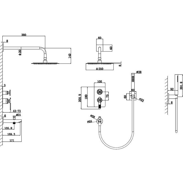 Душевая система для ванны Bronze de Luxe 1760’s Loft 6630CG, верхний душ 250 мм. Материал латунь, цвет матовое золото.