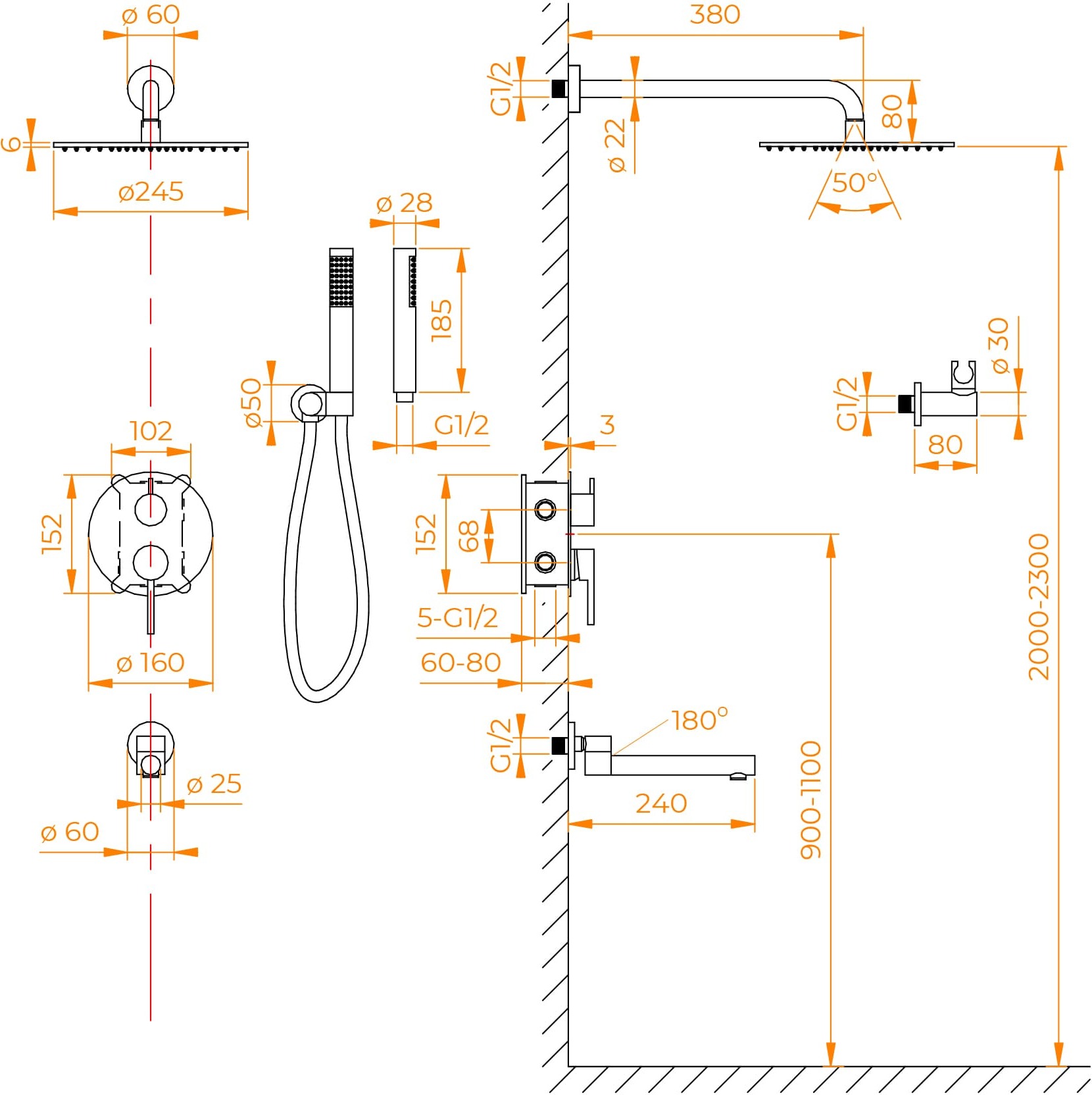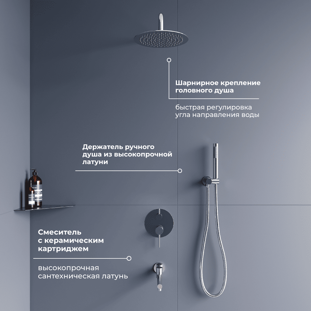 Головной душ 250 мм, горизонтальный держатель - нержавеющая сталь