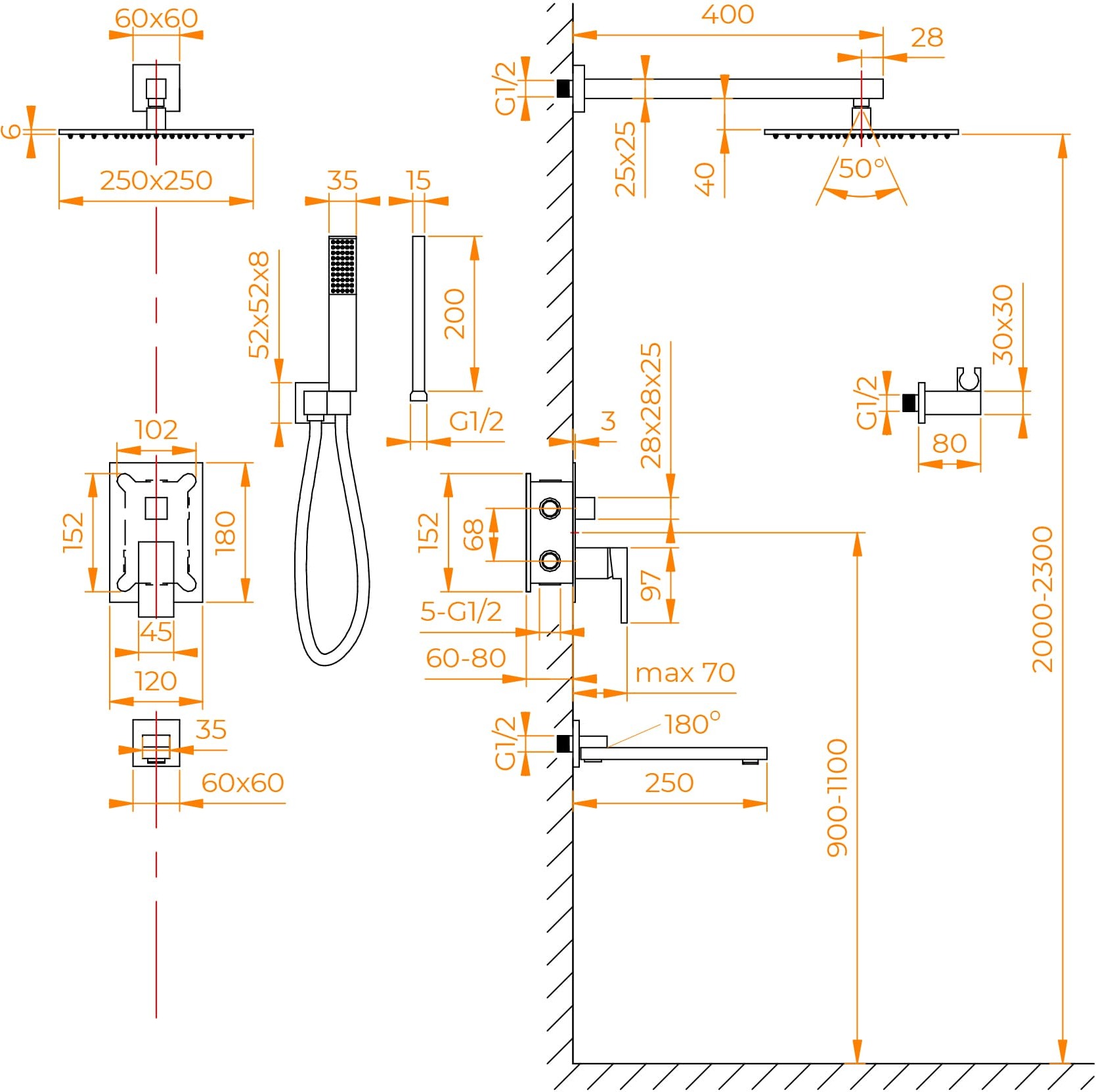Головной душ 250 мм, горизонтальный держатель из нержавеющей стали