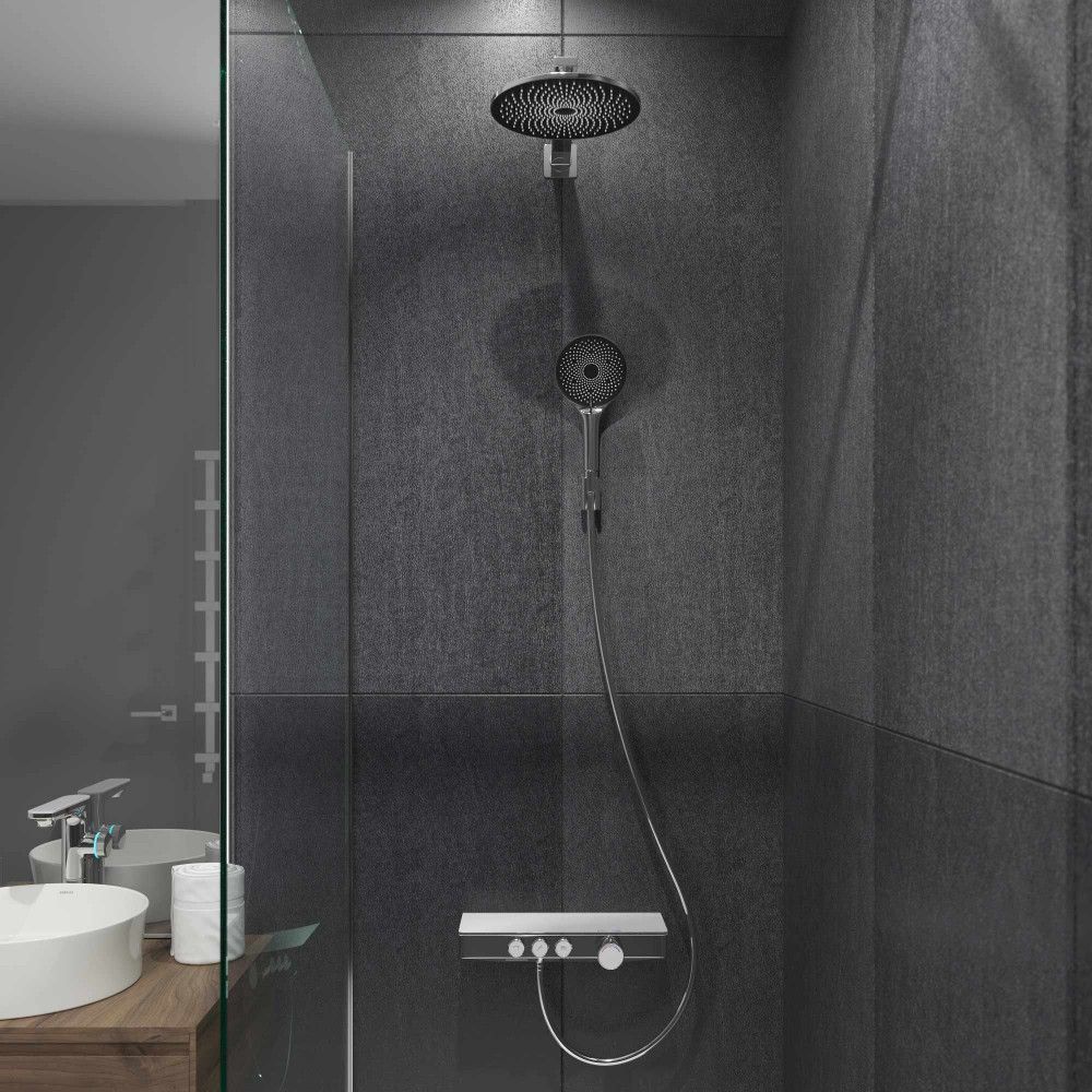Трехфункциональный термостат\nВстраиваемая система\nЛатунный корпус\nСталинитовая пластина и пластиковая крышка для защиты от ожогов\nДушевой шланг 150 см из ПВХ\nМатериал держателя верхнего душа: нержавеющая сталь\nНасадка верхнего душа диаметром 25см, ABS пластик\nВылет верхнего душа: 40 см\nМатериал ручного душа: ABS пластик\nСистема против известковых отложений\nСтандарт подводки: 1/2"\nКол-во режимов ручного душа: 3\nДушевой комплект BERGES MORANS - встраиваемый душевой комплект обладает трёхрежимной системой и включает в себя: Верхний Душ «Тропический ливень», Ручной Душ и Излив для наполнения ванны.\nСистема оборудована термостатическим управлением, что позволяет поддерживать комфортную и неизменную температуру воды, а так же оберегает от ожогов.\nВерхний душ диаметром 25 см обеспечивает комфортное принятие SPA процедур, держатель верхнего душа имеет размер вылета из стены 40 см.\nШланг для Ручного Душа выполнен из мягкого пластика длиной 150 см, что обеспечивает долгий срок службы, а так же гибкость, необходимую, для удобного применения.\nФорма корпуса смесителя выполнена в виде полочки из закаленного стекла, позволяя комфортно хранить необходимые принадлежности для душа.