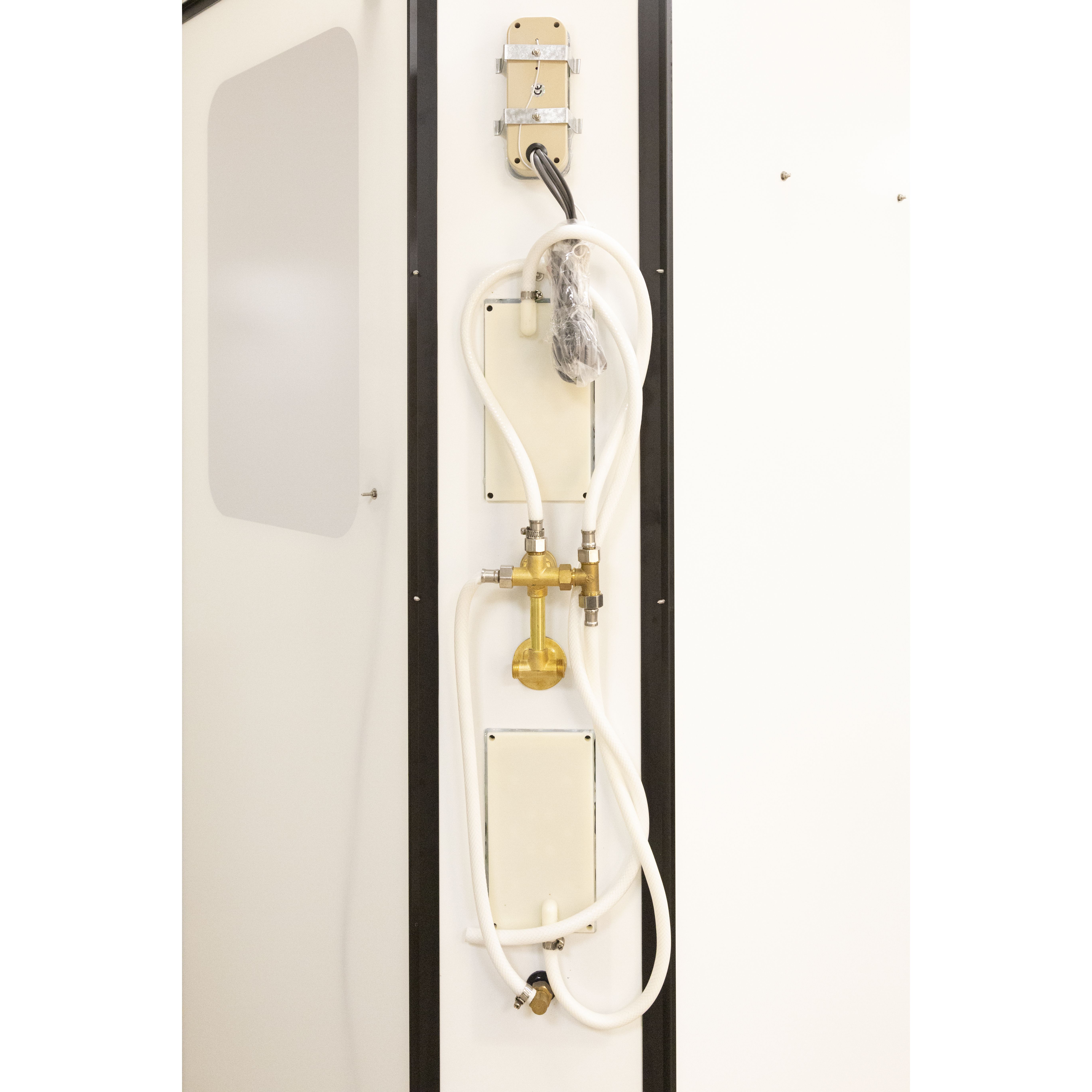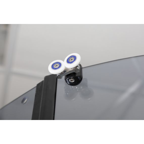 Двери и переднее стекло: Прозрачные 6 мм, двери зарываются плотно с помощью магнитной ленты, вода не выплёскивается так как установлены брызговики между дверью и неподвижной стенкой. Ручки дверей железные. Ролики стальные и надежные.