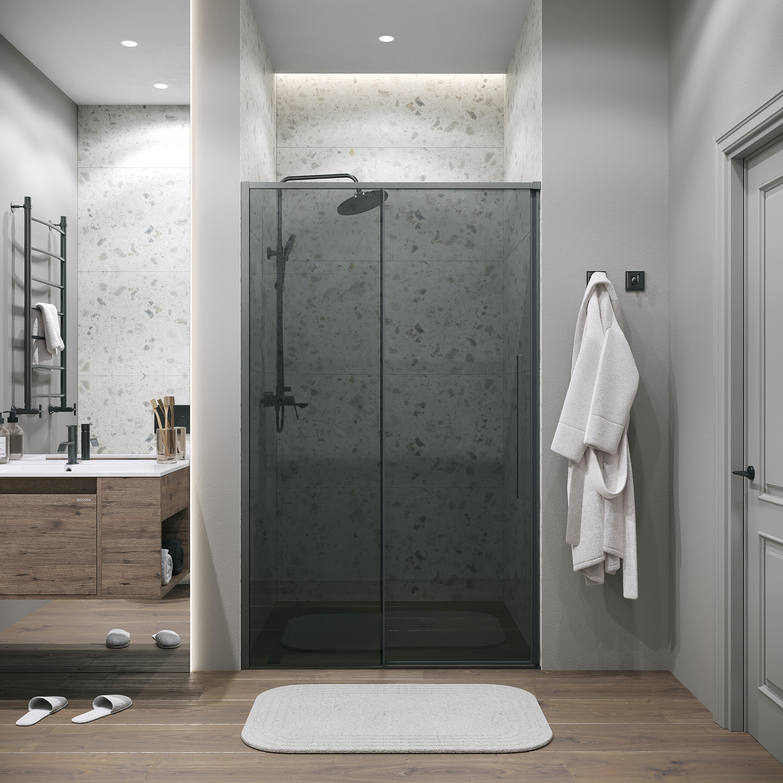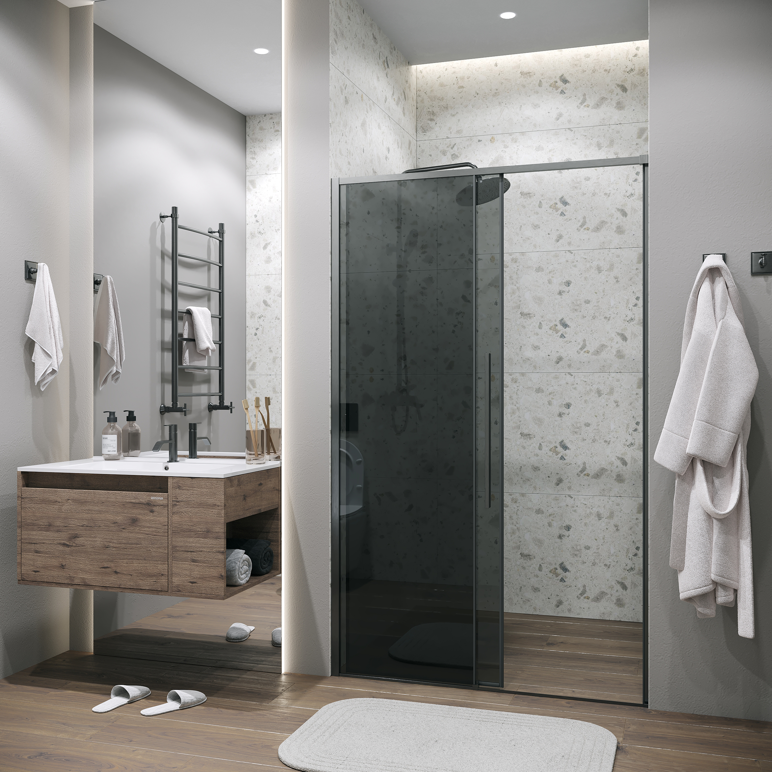 Душевая дверь Grossman Galaxy 100.K33.01.110.42.10, размер 1100x1950 мм, профиль графит сатин, стекло тонированное. Габариты регулировки (1090-1100)x1950 мм. Вход 466 мм.