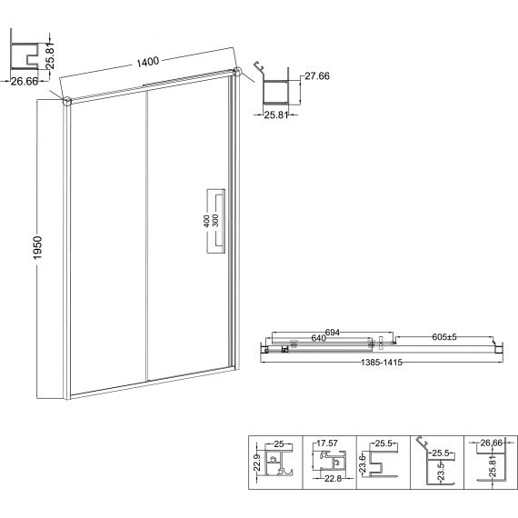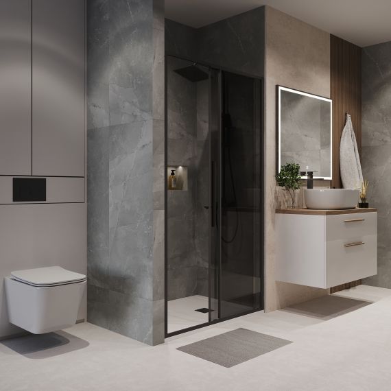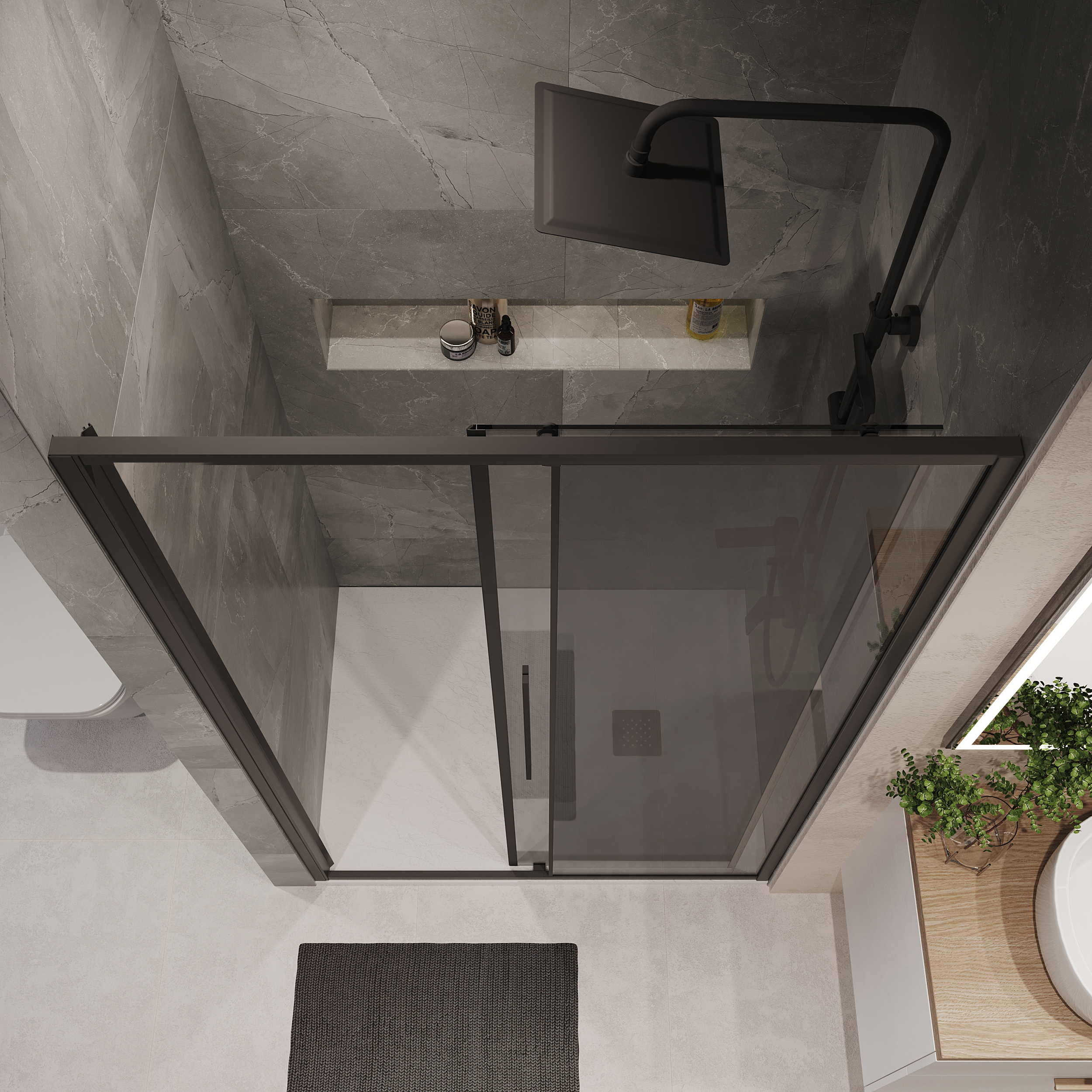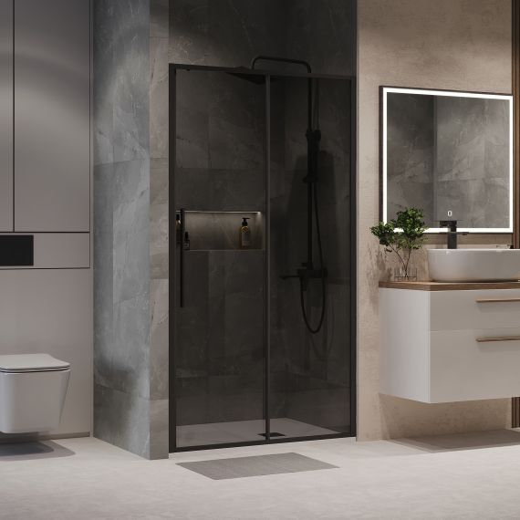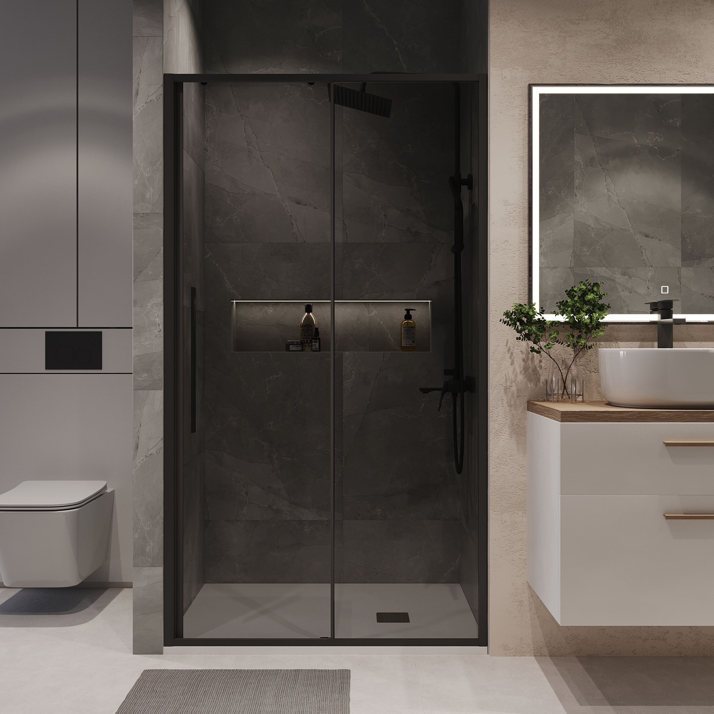 Душевая дверь Niagara Nova NG-85-14TB, размер 1400xx1950 мм, профиль чёрный матовый, стекло тонированное. Габариты регулировки (1385-1415)x1950 мм, вход 605 мм.