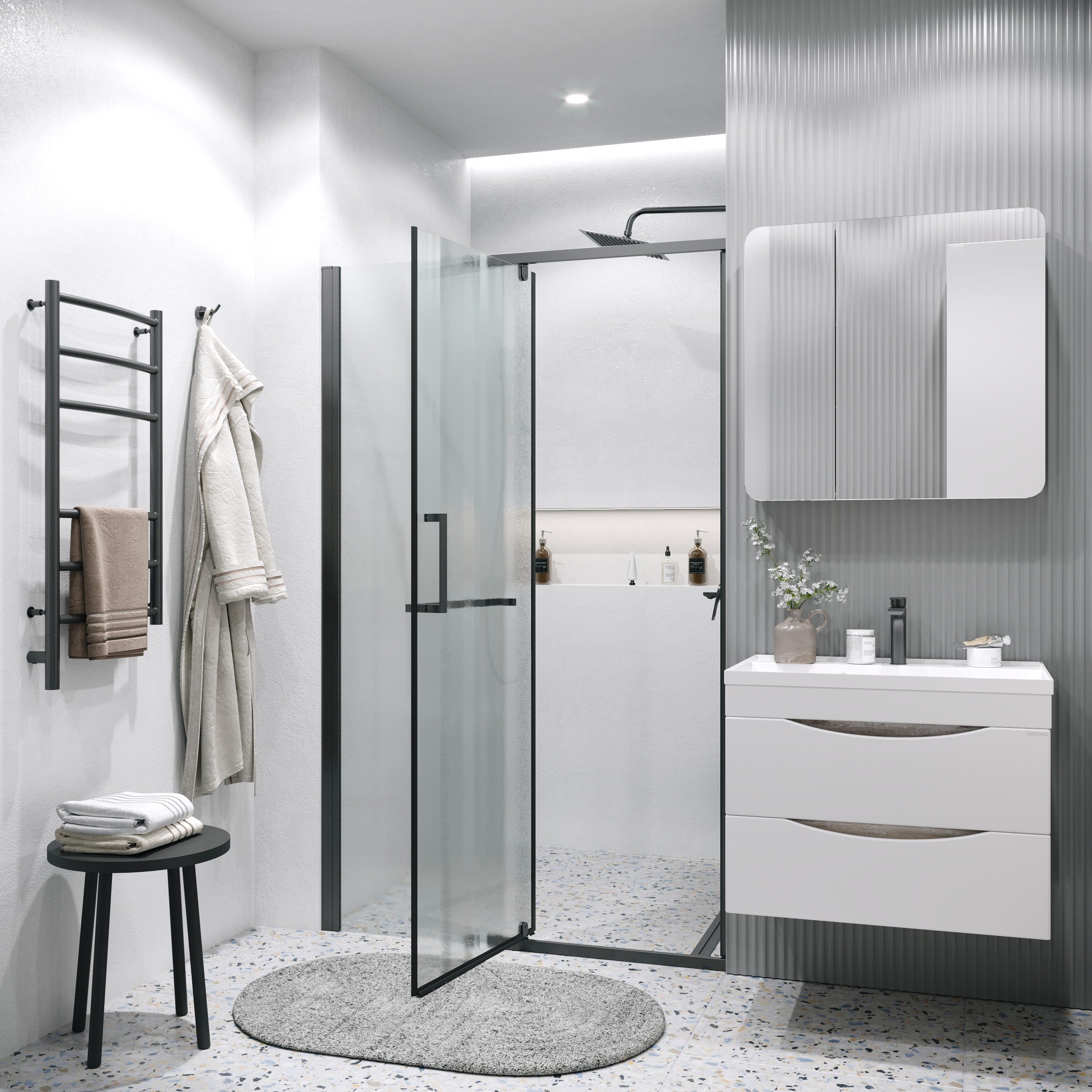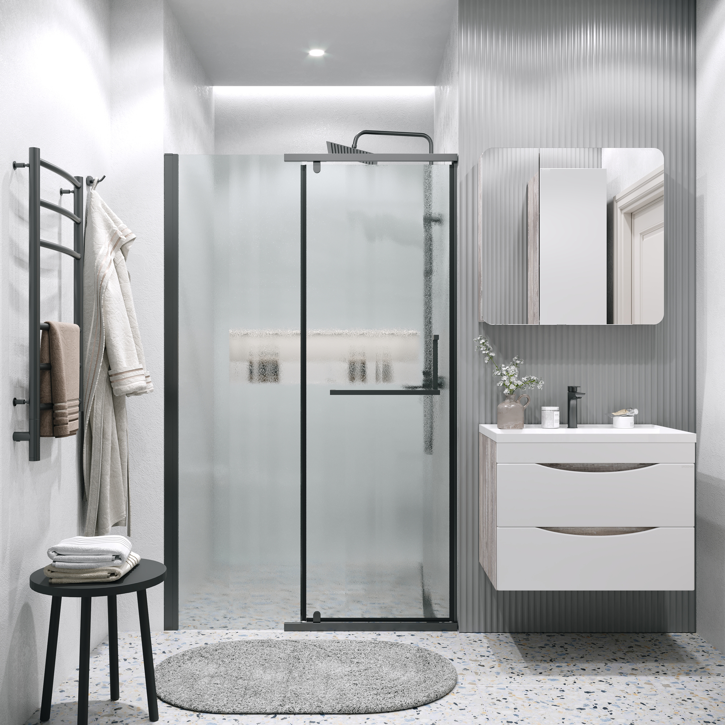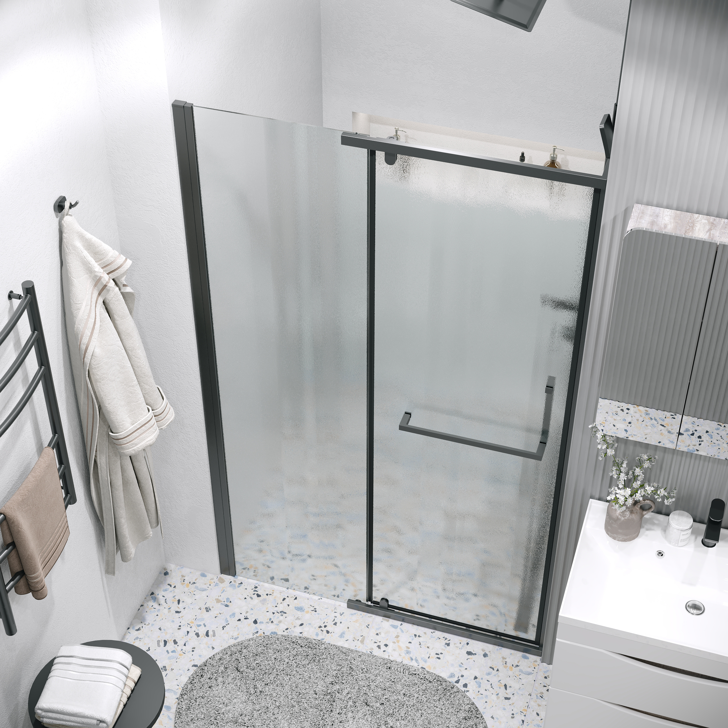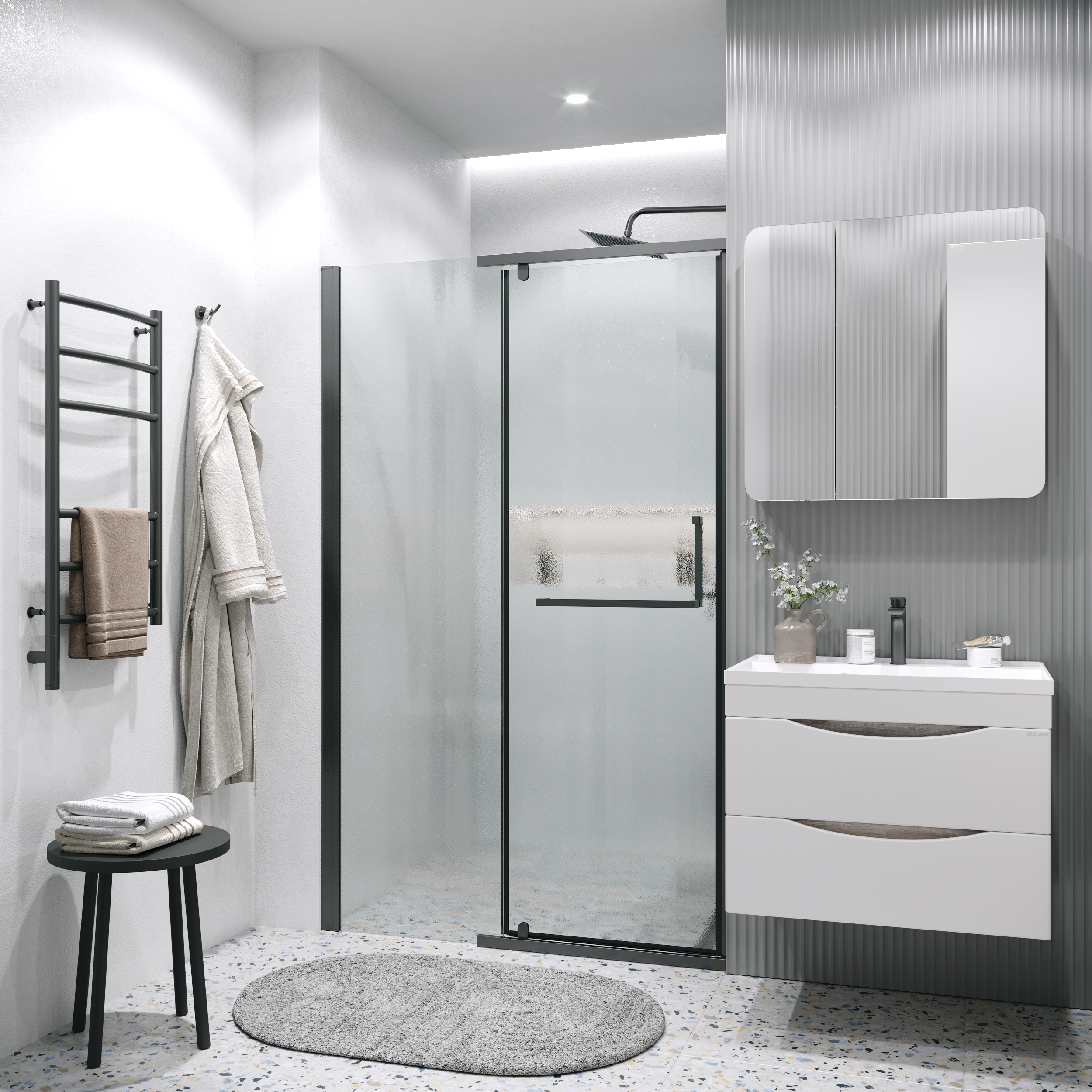 Душевая дверь Grossman Pragma 100.K33.03.100.21.02, размер 1000x1950 мм, профиль чёрный матовый, стекло шиншилла. Габариты регулировки (990-1010)x1950 мм. Вход 556 мм.