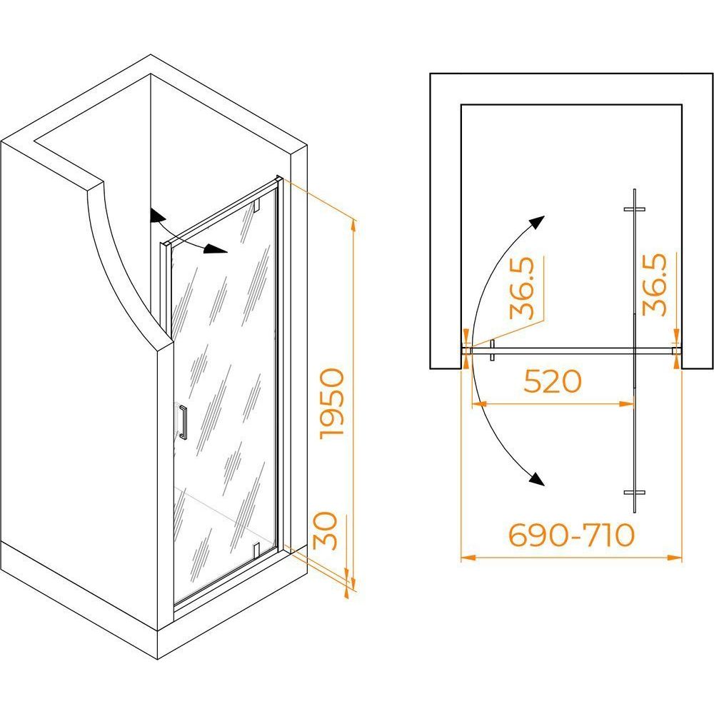 Душевая дверь RGW LE-102, размер 700х1950 мм, профиль хром, цвет стекла прозрачное, 6 мм. Габариты регулировки (690-710)х1950 мм, вход 520 мм. Душевой поддон приобретается отдельно.