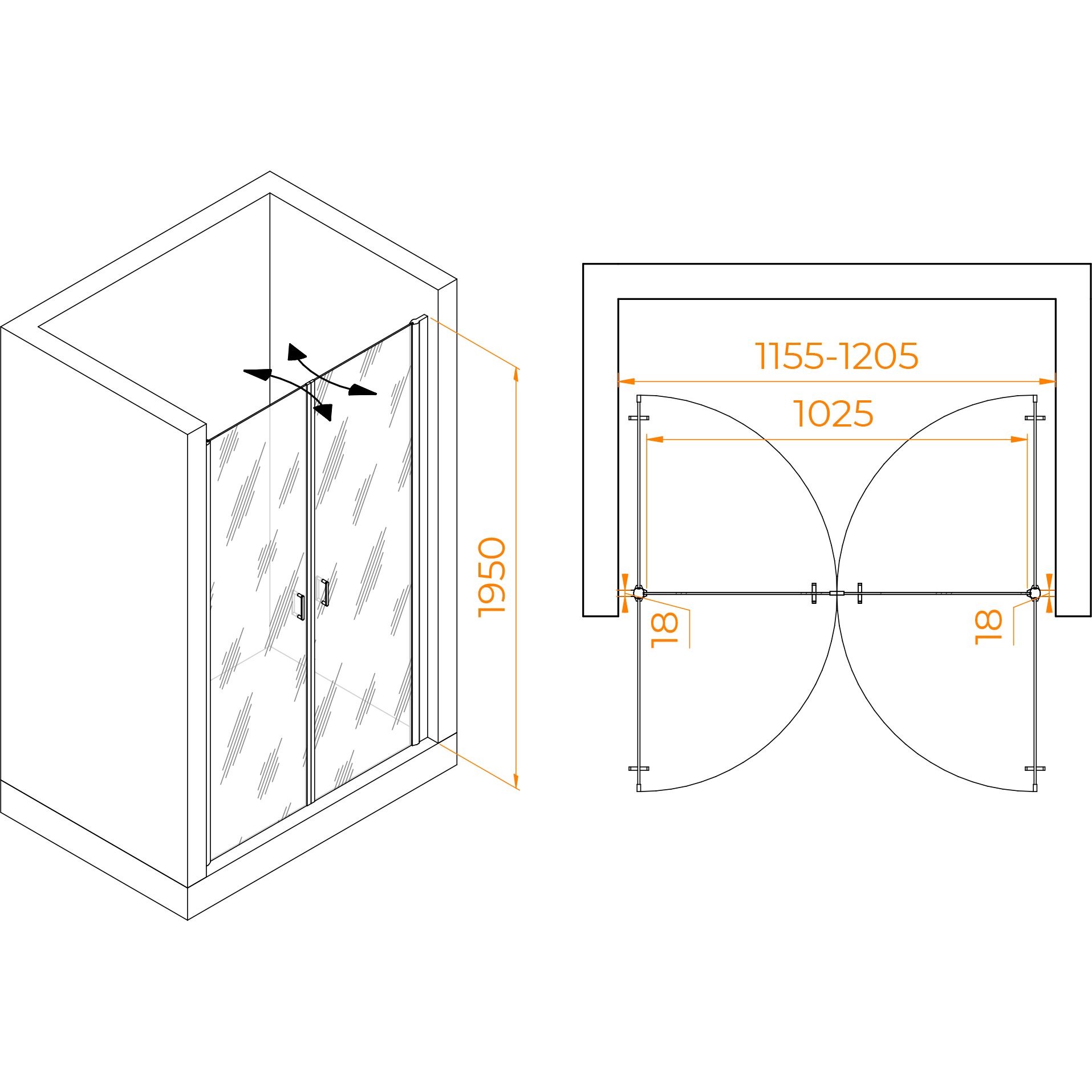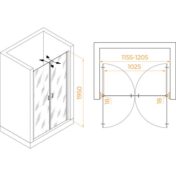 Душевая дверь RGW PA-104, размер 1200х1950 мм, профиль хром, стекло прозрачное 6 мм. Габариты регулировки (1155-1205)х1950 мм. Вход 1080 мм. Поддон приобретается отдельно.