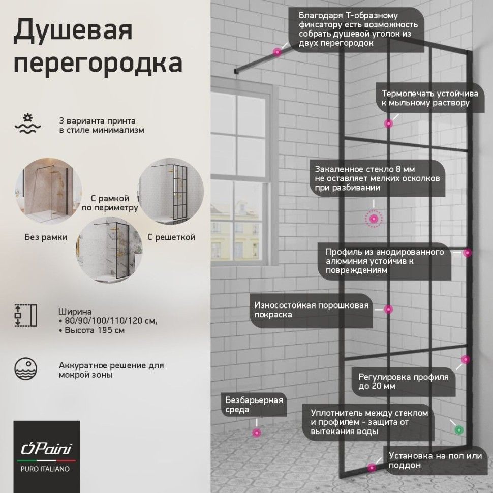 Душевая перегородка с рисунком в виде решетки PAINI позволяет комплексно подойти к обустройству безбарьерной среды в ванной комнате. Стильный образ конструкции обеспечивается сочетанием профиля в виде решетки из анодированного алюминия с прочным покрытием черного цвета и закаленного стекла. Лаконичный дизайн, современные материалы, а также легкость в уходе и безопасность – все это делает ширмы PAINIоптимальным решением для обустройства душевой зоны.