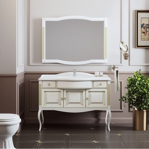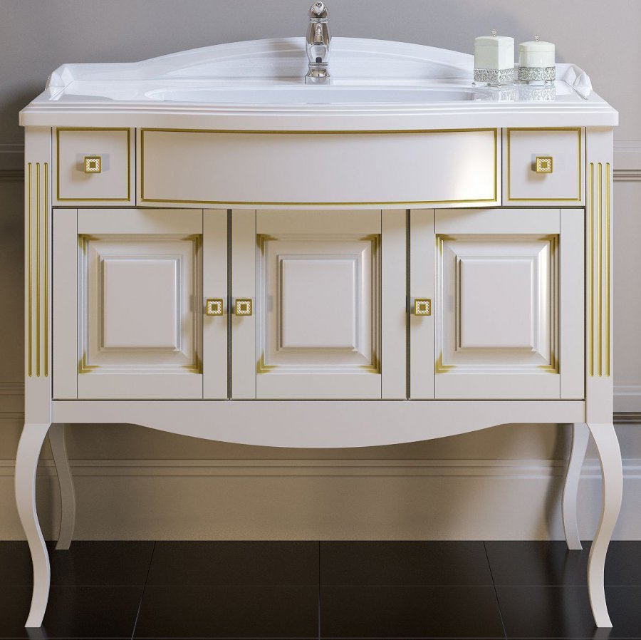 Тумба напольная с раковиной (Лаура 120 см), цвет белый матовый/бежевая патина/swarovski золото.
