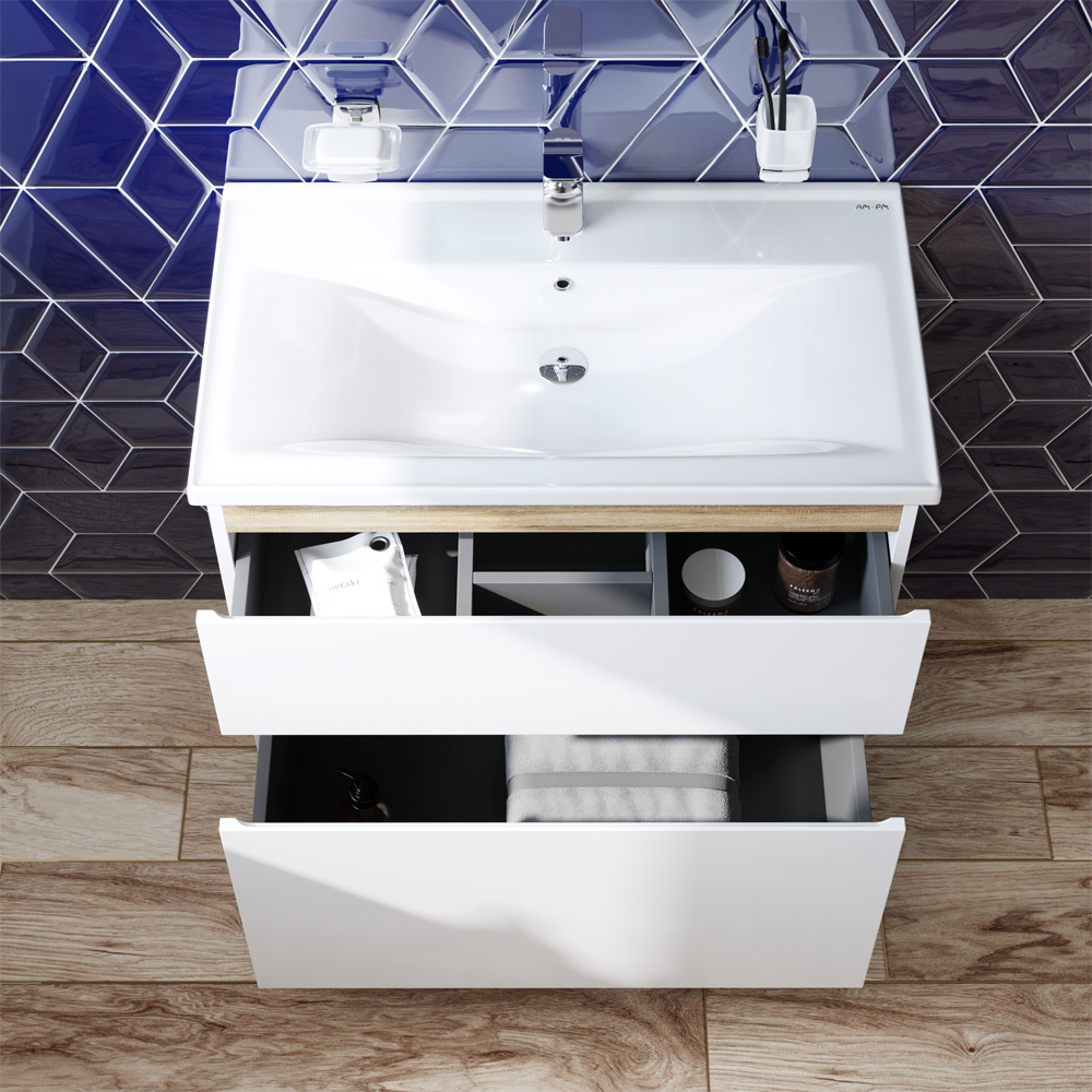 Впервые на рынке – дизайнерская коллекция сантехники которую может позволит себе каждый. Самое эстетичное сочетание цветов и фактур от дизайн-бюро Danelon Meroni (Великобритания & Италия): белые глянцевые фасады дополнены отделкой под светлое дерево. Функциональный органайзер в первом ящике позволит хранить необходимые косметические средства под рукой и в полном порядке. Внутреннее покрытие каждого ящика выполнено в современном цвете Anthracite и имеет противоскользящее покрытие. Встроенная керамическая раковина белоснежного цвета оснащена специальным бортиком для защиты от пролива воды за мебель. Экологически чистые и удивительно долговечные полиакриловые эмали – специальная технология покраски в 7 слоев превосходит технологию нанесения автоэмали у ведущих немецких марок и обеспечивает насыщенный цвет в течение всего срока службы (от 10 лет).