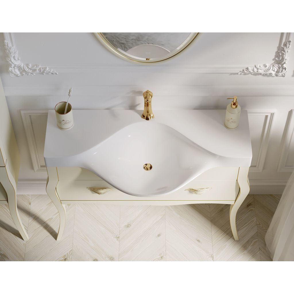 Тумба напольная Clarberg Borgia 110 см с раковиной Brodway 110 см, с 1 ящиком, оснащенными скрытыми направляющими австрийской фирмы Blum с системой мягкого закрывания, цвет слоновая кость/патина золото.