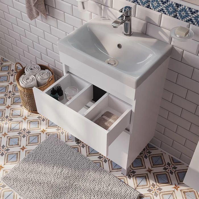 Компактная напольная тумба для ванной комнаты Zodiac с умывальником и ящиками – высокий уровень удобства и практичности в сочетании с лаконичным универсальным дизайном.