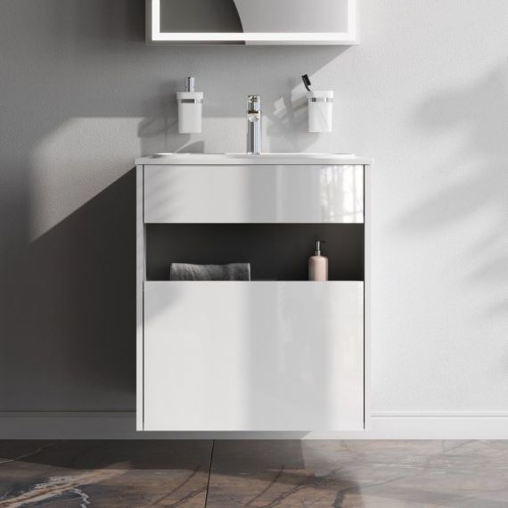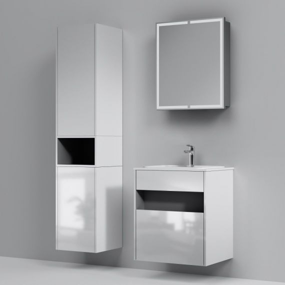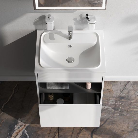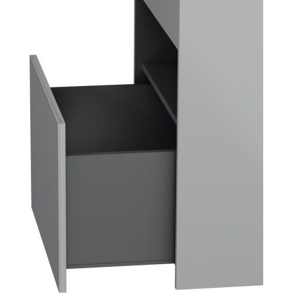 Удобный выдвижной ящик и вместительная открытая ниша позволяют хранить все необходимые средства под рукой. Невероятно мягкое открытие и закрытие благодаря направляющим скрытого монтажа с системой soft close.