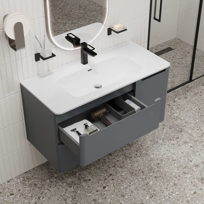 Вместительная подвесная тумба с плоским умывальником Edifice стильного темно-серого цвета – воплощение современного минимализма. Мягкие линии корпуса в сочетании с удобными интегрированными ручками выглядят свежо и актуально. Смотрится аккуратно, легко и не усложняет процесс уборки в ванной благодаря подвесной конструкции.