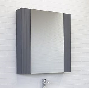Зеркальное высококачественное полотно с амальгамой на основе серебра. Створка декорирована вертикальной фрезеровкой и оснащена петлями плавного закрывания. За створкой две полки. В модели применяется плёнка с эффектом Soft-Touch.
