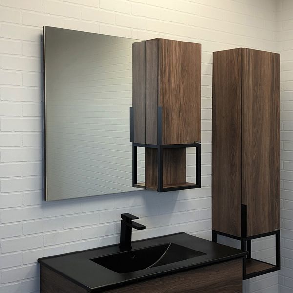 Зеркальное высококачественное полотно с амальгамой на основе серебра. Зеркало с металлическим каркасом, с одной створкой оснащённой петлями с системой плавного закрывания и полкой открытого хранения.