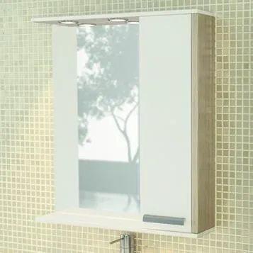 Зеркальное высококачественное полотно с амальгамой на основе серебра. Створка мебельного элемента оснащена петлями с плавным закрыванием и покрыта белой глянцевой эмалью. В верхнюю полку встроены два точечных светильника и выключатель.