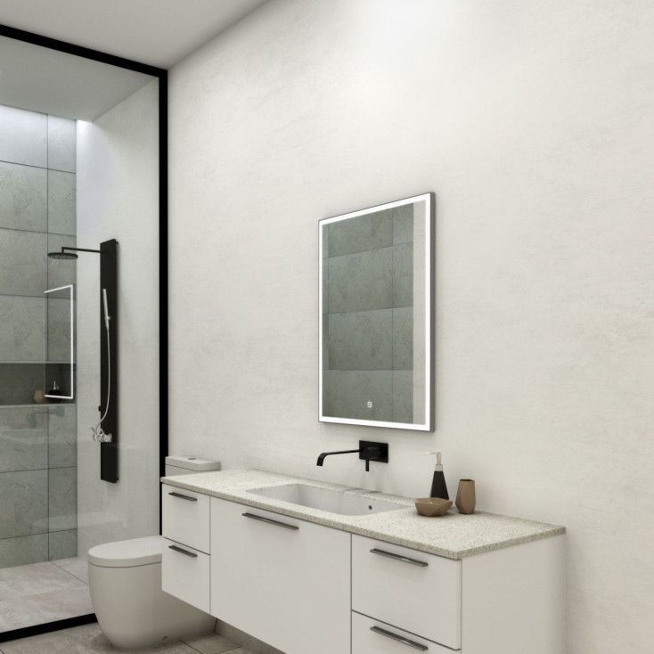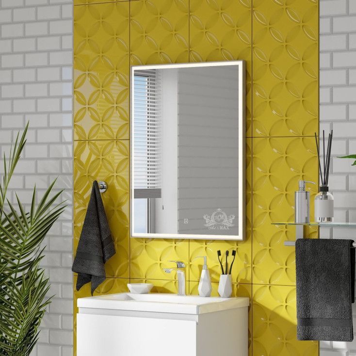 Зеркало Art&Max Arezzo Led 60 см AM-Are-600-800-DS-F, с подсветкой "холодного" типа, диммером и сенсорным выключателем. По периметру зеркала профиль из полированного алюминия, задняя часть корпуса закрыта.