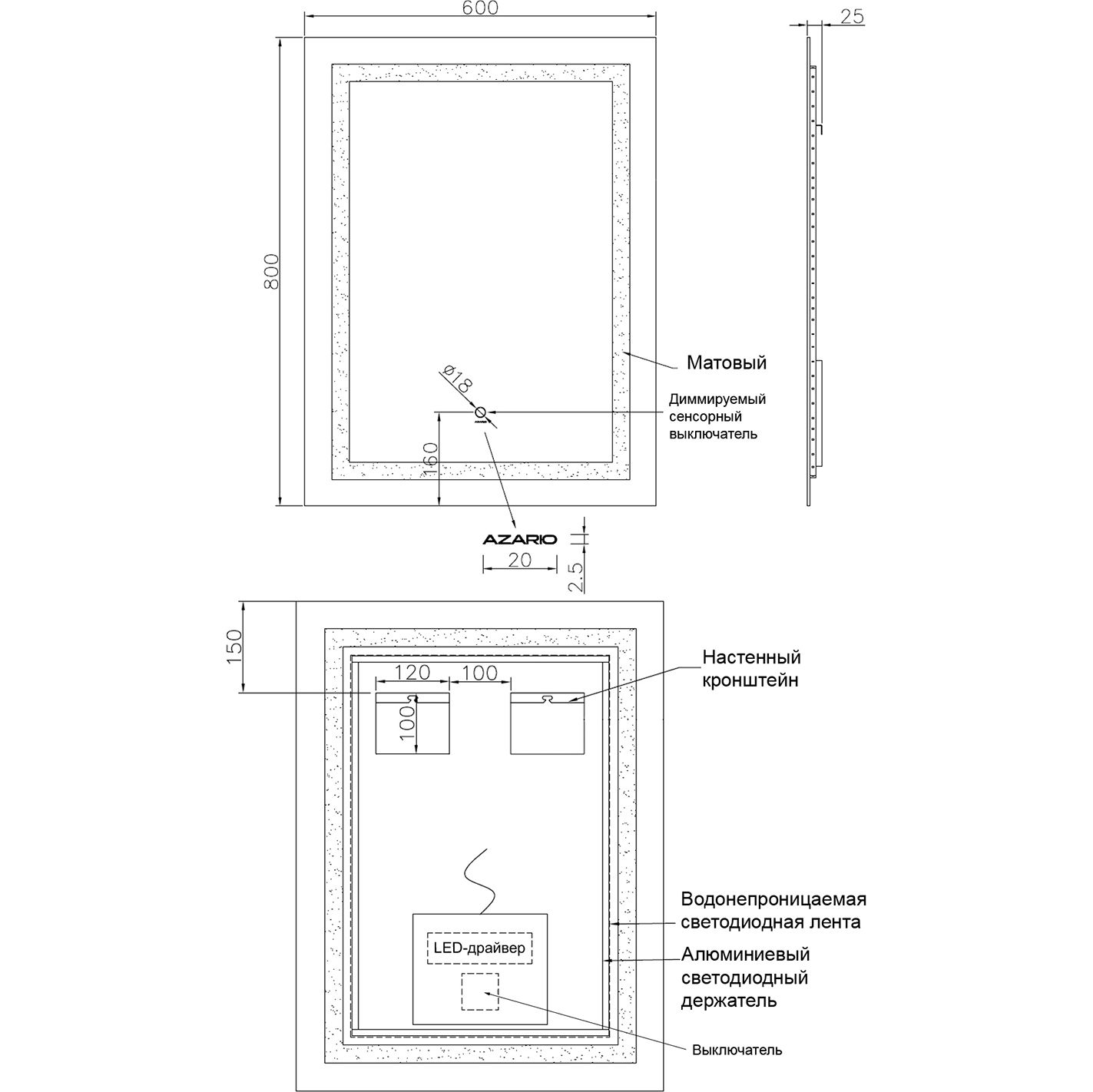 Зеркало Azario Alysa AZ-Z-046CSNEW с подсветкой, сенсорный выключатель с функцией диммера, размер 600х800 мм