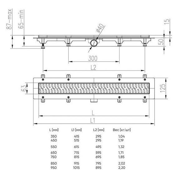 Нижняя часть изготовлена из PP и PS, рамка желоба и решетка изготовлены из нержавеющей стали DIN 1.4301, с возможностью нагрузки K3 (до 300 кг).