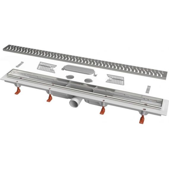 В комплекте - самоклеящаяся гидроизоляционная фолия, регулируемые опоры (ножки), комплект крепления (нейлоновые дюбеля и шурупы), решетка из нержавеющей стали, пластиковый ключ для поднятия нержавеющей решетки и монтажная инструкция по установке.