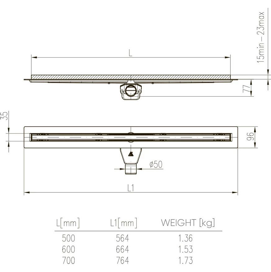 Монтажная длина душевого лотка больше длины решетки на 65 мм (например: решетка 500 мм - монтажная длина лотка 565 мм).