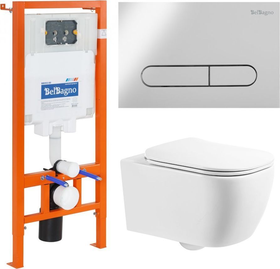 Инсталляция с подвесным безободковым унитазом BelBagno Genova BB1102CH/BB1102SC/BB002-80/BB005-PR-CHROME (кнопка смыва Prospero, хром)