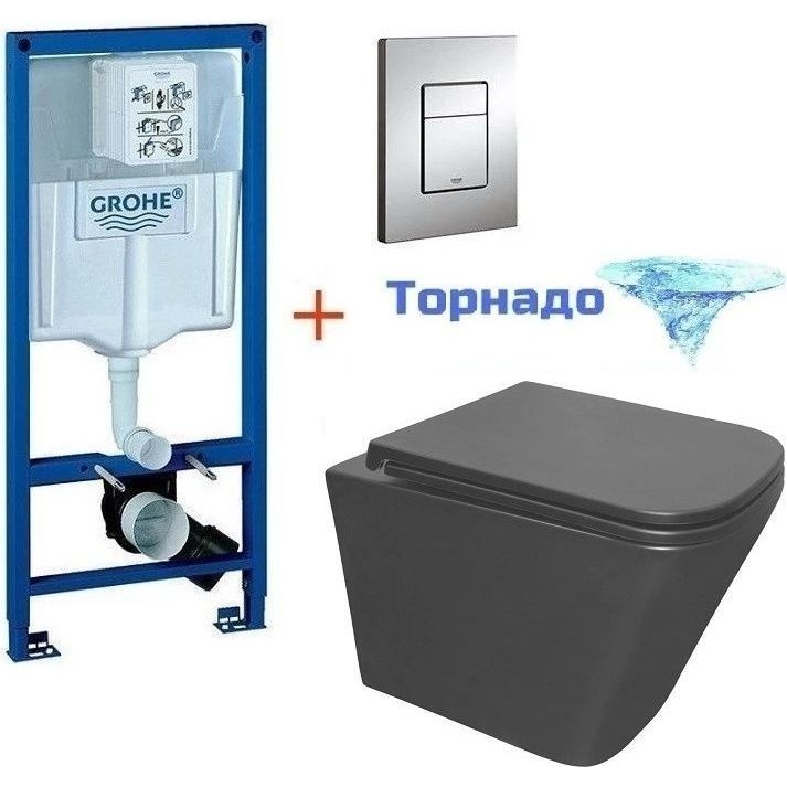 Инсталляция с подвесным унитазом комплект: Grohe Rapid SL 38772001 с подвесным безободковым унитазом Azario Teramo AZ-0052-UQ1MB сиденье микролифт, крепление, кнопка смыва хром (Система смыва торнадо)
