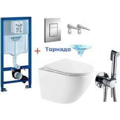 Инсталляция с подвесным унитазом комплект: Grohe Rapid SL 38772001 с подвесным безободковым унитазом Azario Grado AZ-0046-UQ сиденье микролифт, крепление, кнопка смыва хром (Система смыва торнадо) + набор для гигиенического душа Haiba HB5511.