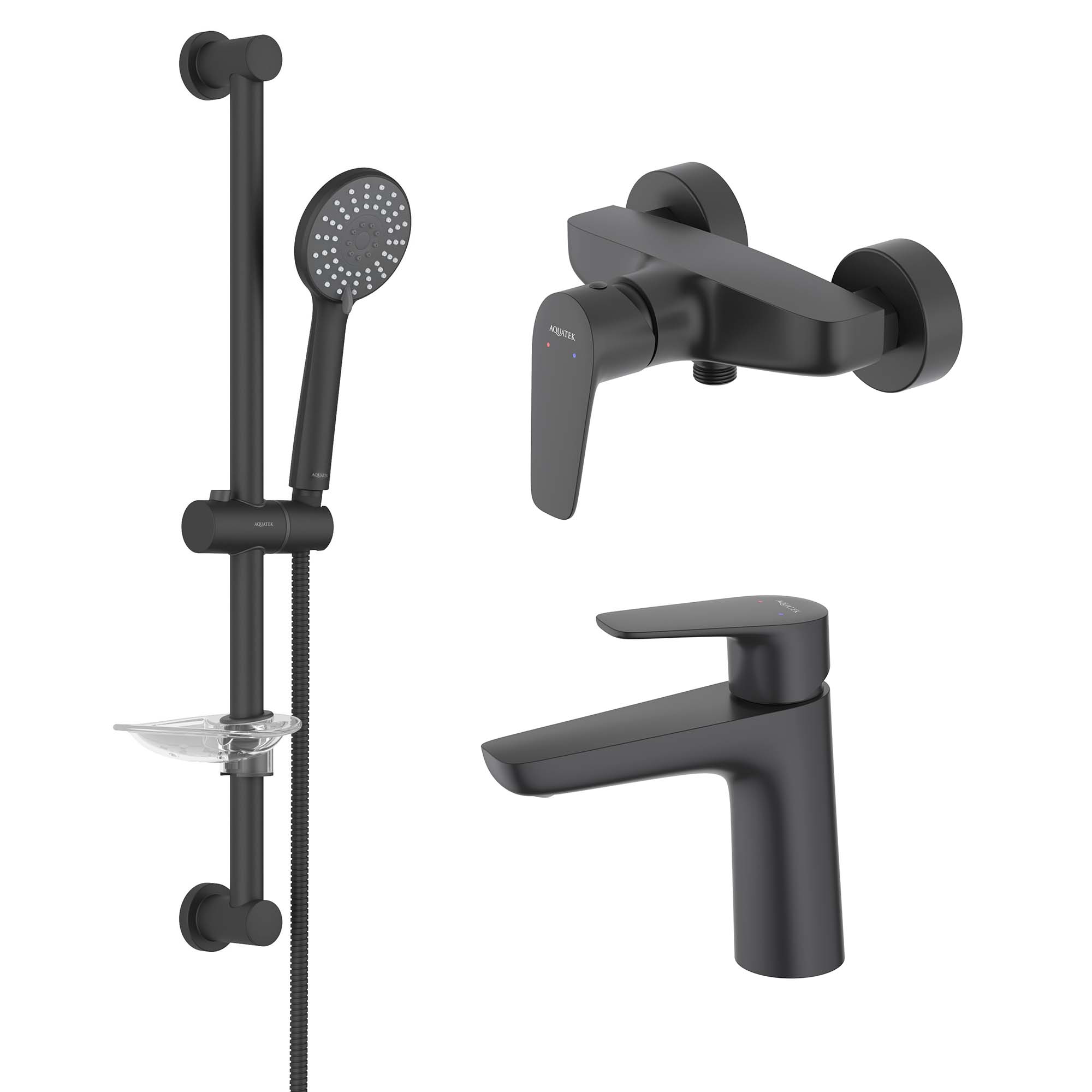 Набор смесителей 3 в 1 для душа Aquatek Бетта AQ1131MB: смеситель для раковины + смеситель для душа + душевой гарнитур, материал латунь, цвет чёрный матовый.