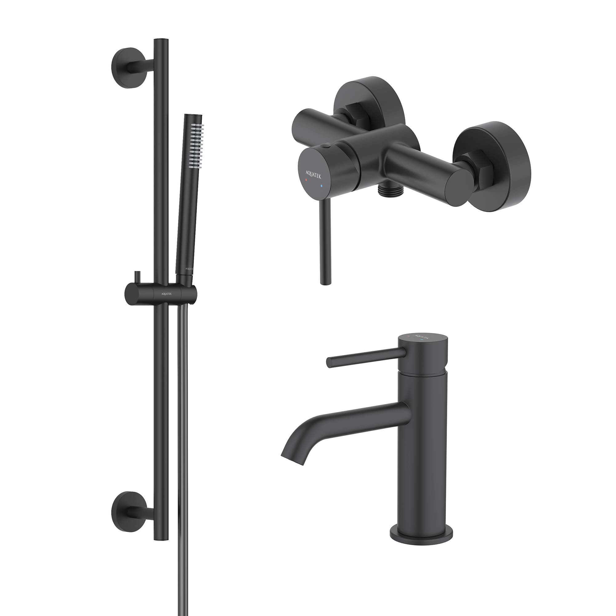 Набор смесителей 3 в 1 для душа Aquatek Европа AQ1331MB: смеситель для раковины + смеситель для душа + душевой гарнитур, материал латунь, цвет чёрный матовый.