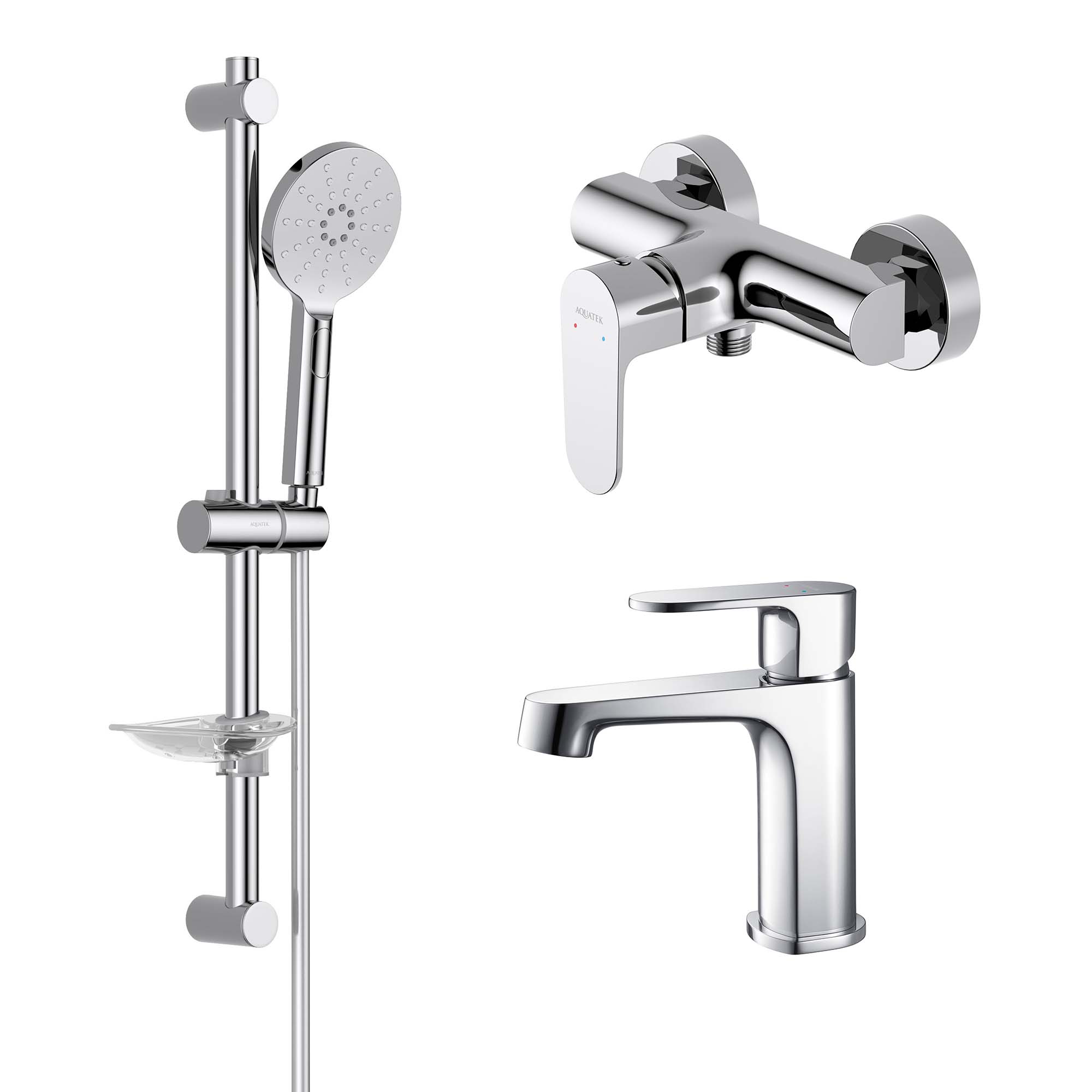 Набор смесителей 3 в 1 для душа Aquatek Оберон AQ1231CR: смеситель для раковины + смеситель для душа + душевой гарнитур, материал латунь, цвет хром.