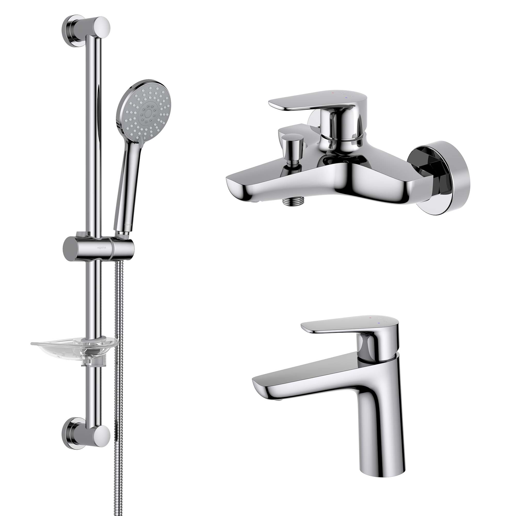 Набор смесителей 3 в 1 для ванны с коротким изливом Aquatek Бетта AQ1130CR: смеситель для раковины + смеситель для ванны + душевой гарнитур, материал латунь, цвет хром.