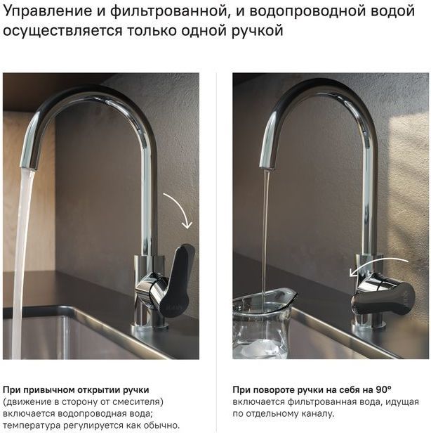подача фильтрованной воды осуществляется при повороте ручки в закрытом состоянии