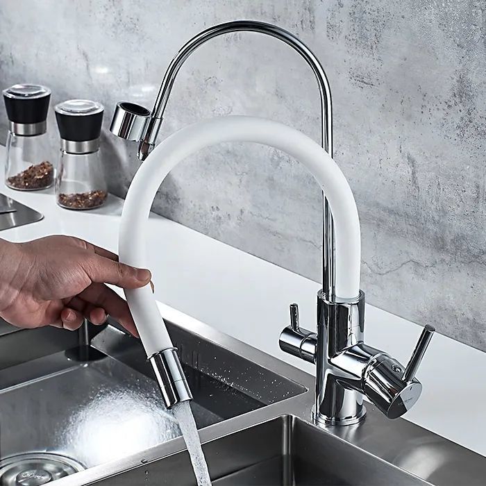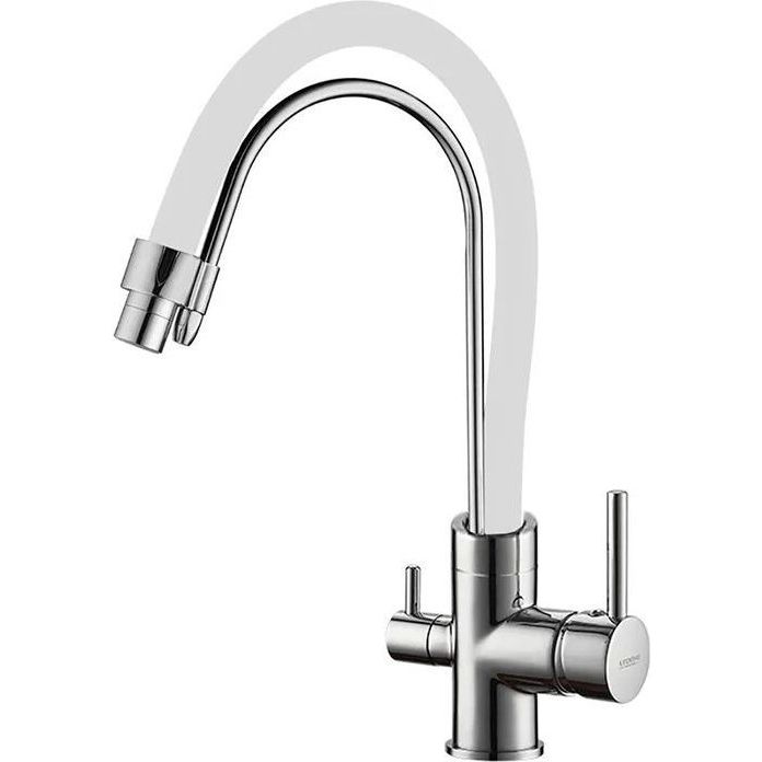Смеситель для кухни Ledeme L4755-3 с гибким изливом и подключением фильтра, материал - латунь, цвет - хром/белый.