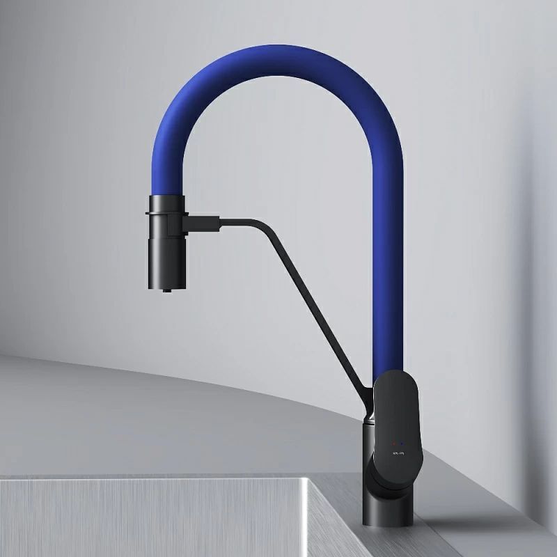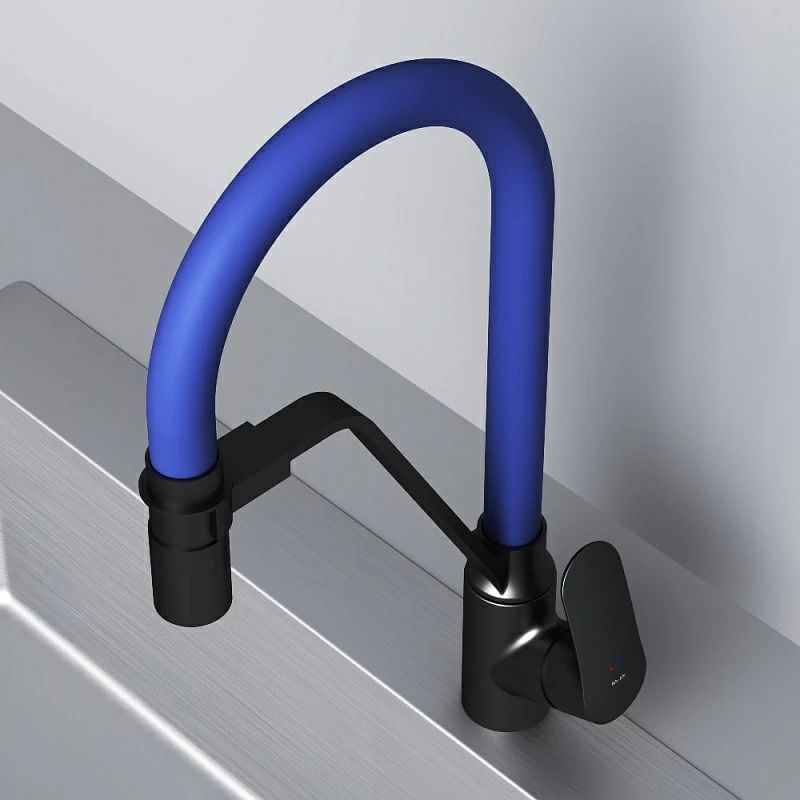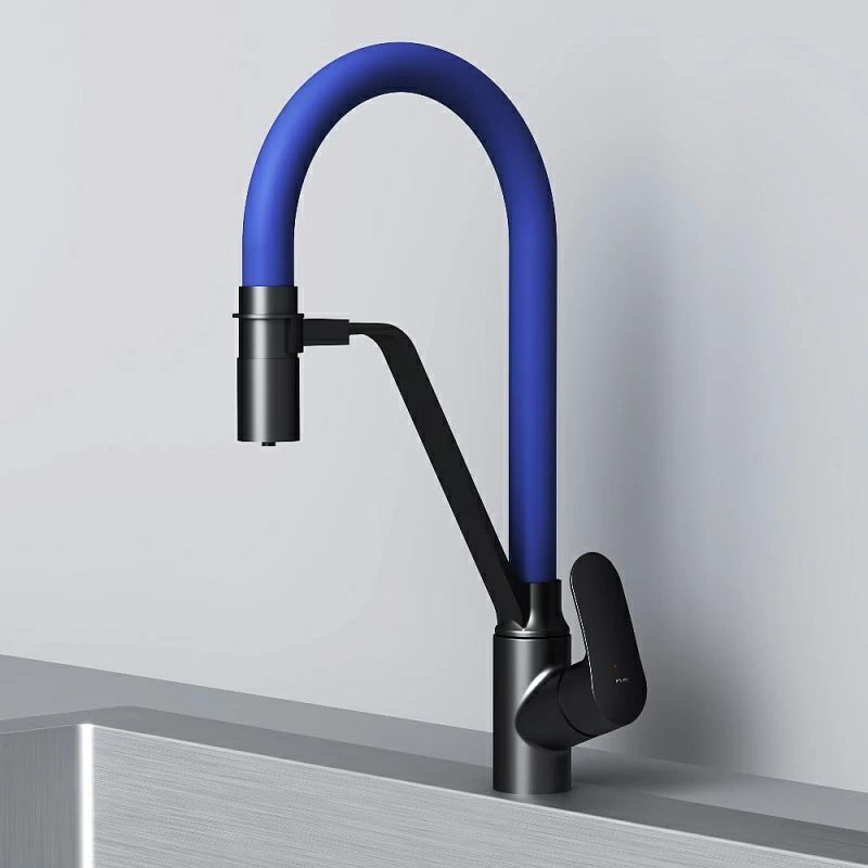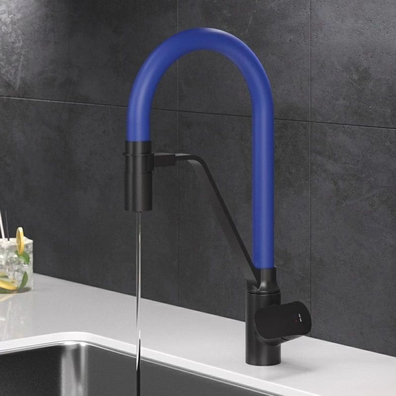 Эффектное сочетание цветов - матовый черный корпус смесителя и синий цвет излива станет ярким дизайнерским решением на кухне.