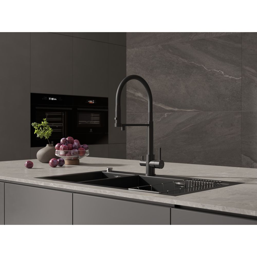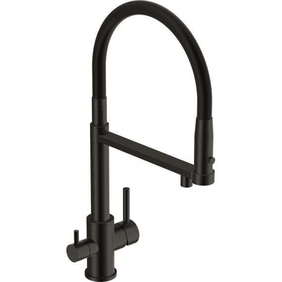 Смеситель для кухни Cersanit Zen A68250 с подключением фильтра питьевой воды и гибким изливом, высота излива 266 мм, материал латунь, цвет чёрный.
