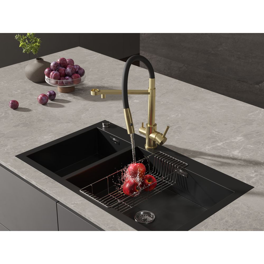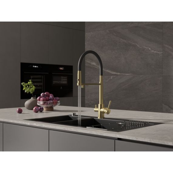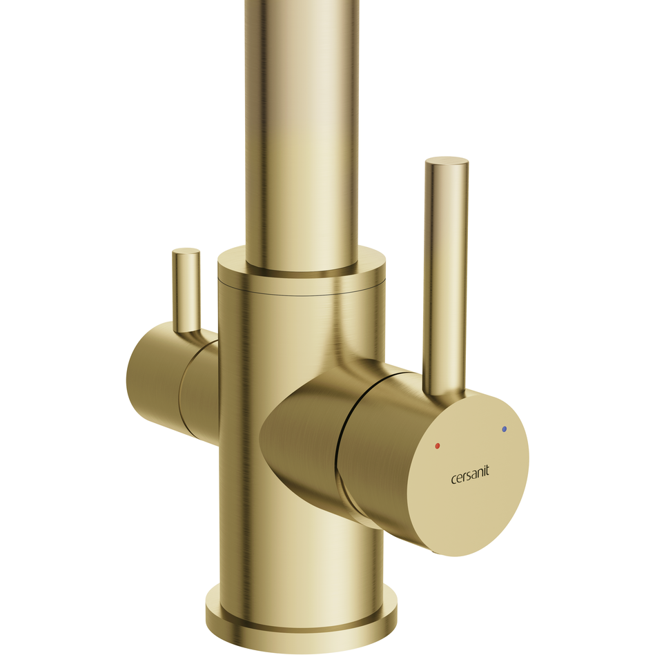 Смеситель для кухни Cersanit Zen A68251 с подключением фильтра питьевой воды и гибким изливом, высота излива 266 мм, материал латунь, цвет золото.
