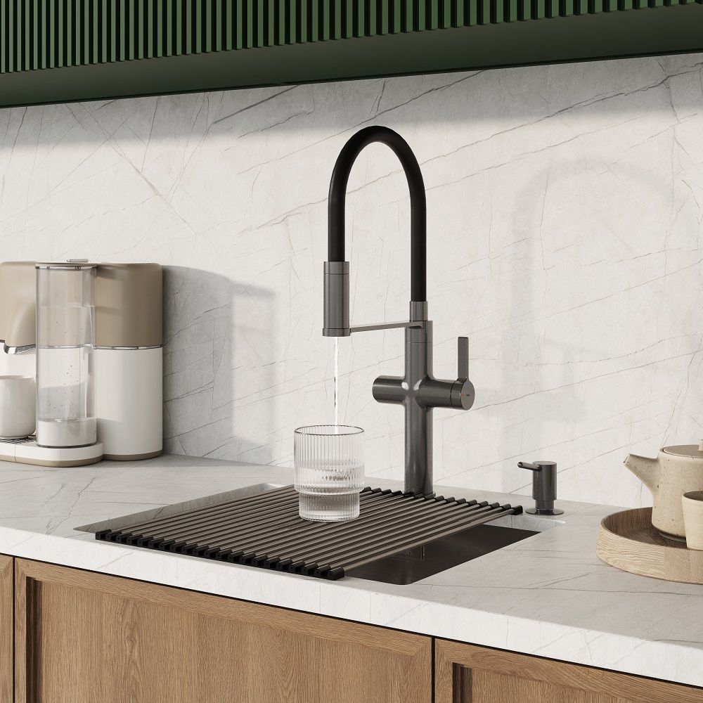 Профессиональный смеситель для кухни Ikon с чёрным гибким изливом и отдельным каналом для фильтрованной воды. Современный, продуманный и функциональный, он успешно справляется с повседневными задачами на кухне.