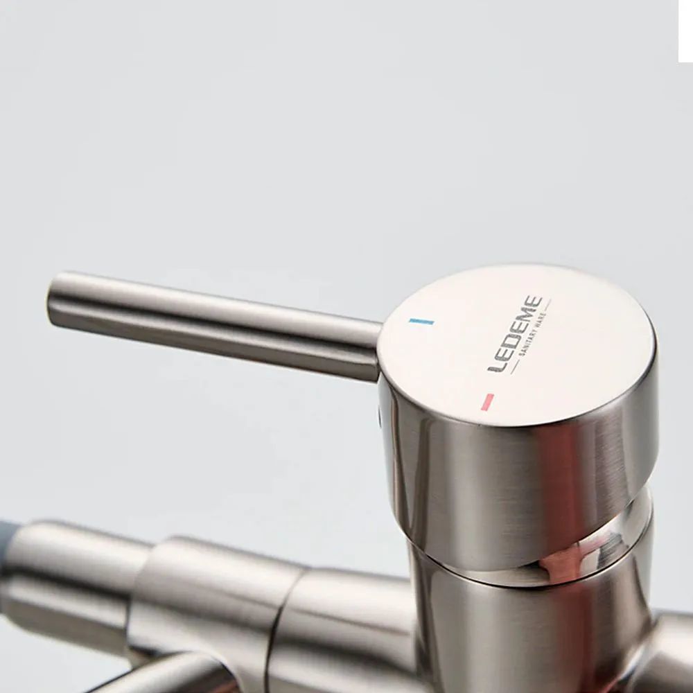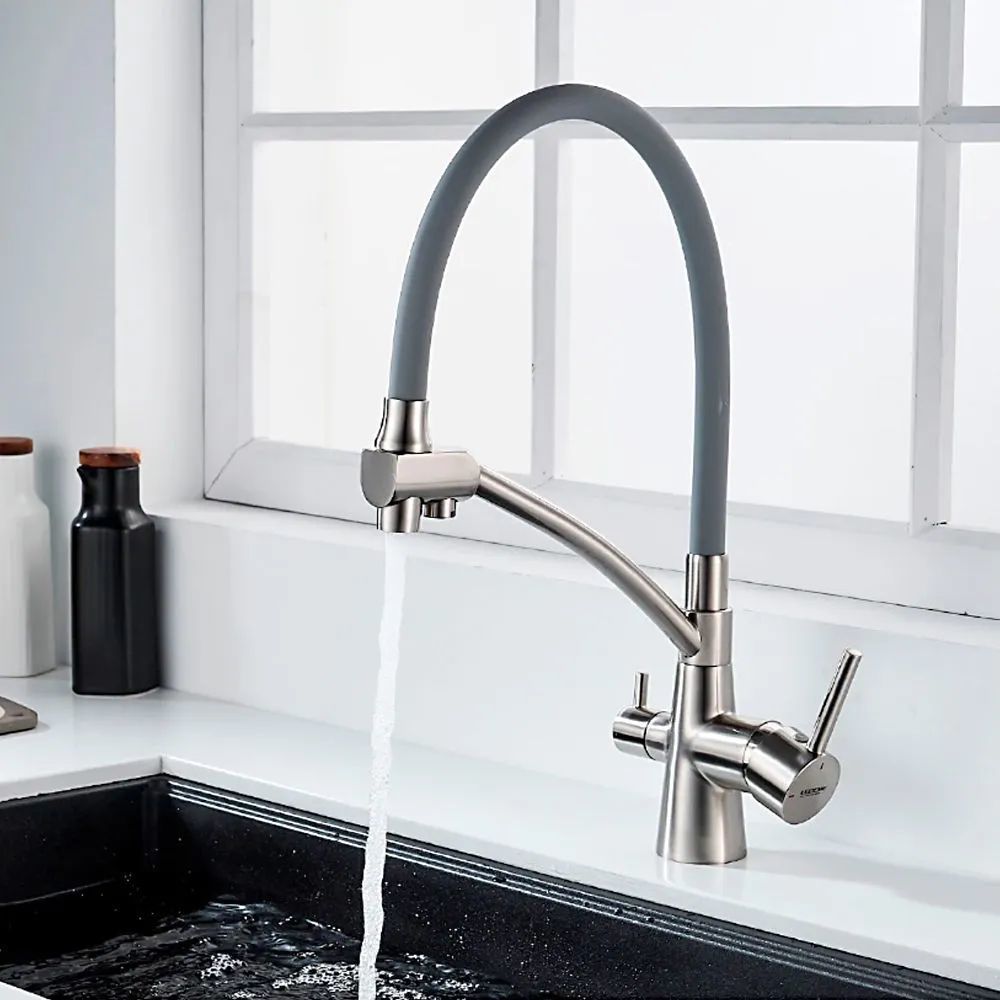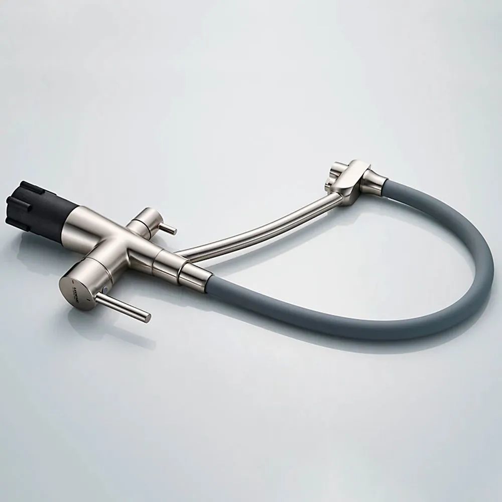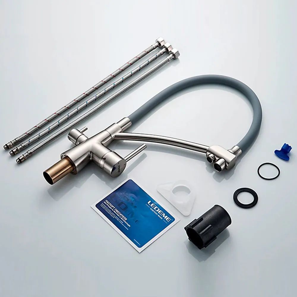 Смеситель для кухни Ledeme L4855A-9 с гибким, поворотным изливом и подключением фильтра питьевой воды, материал - латунь, цвет - сатин/серый.