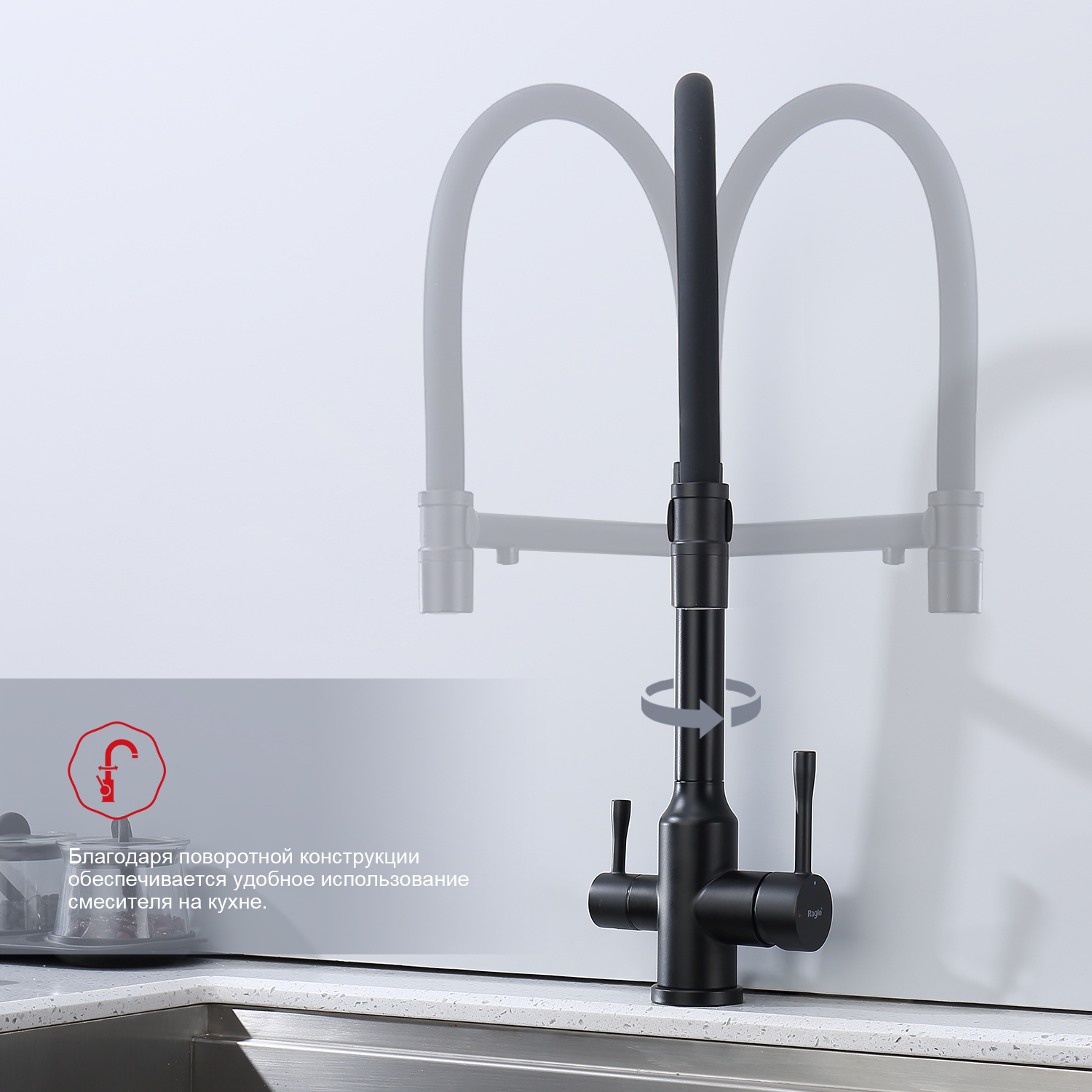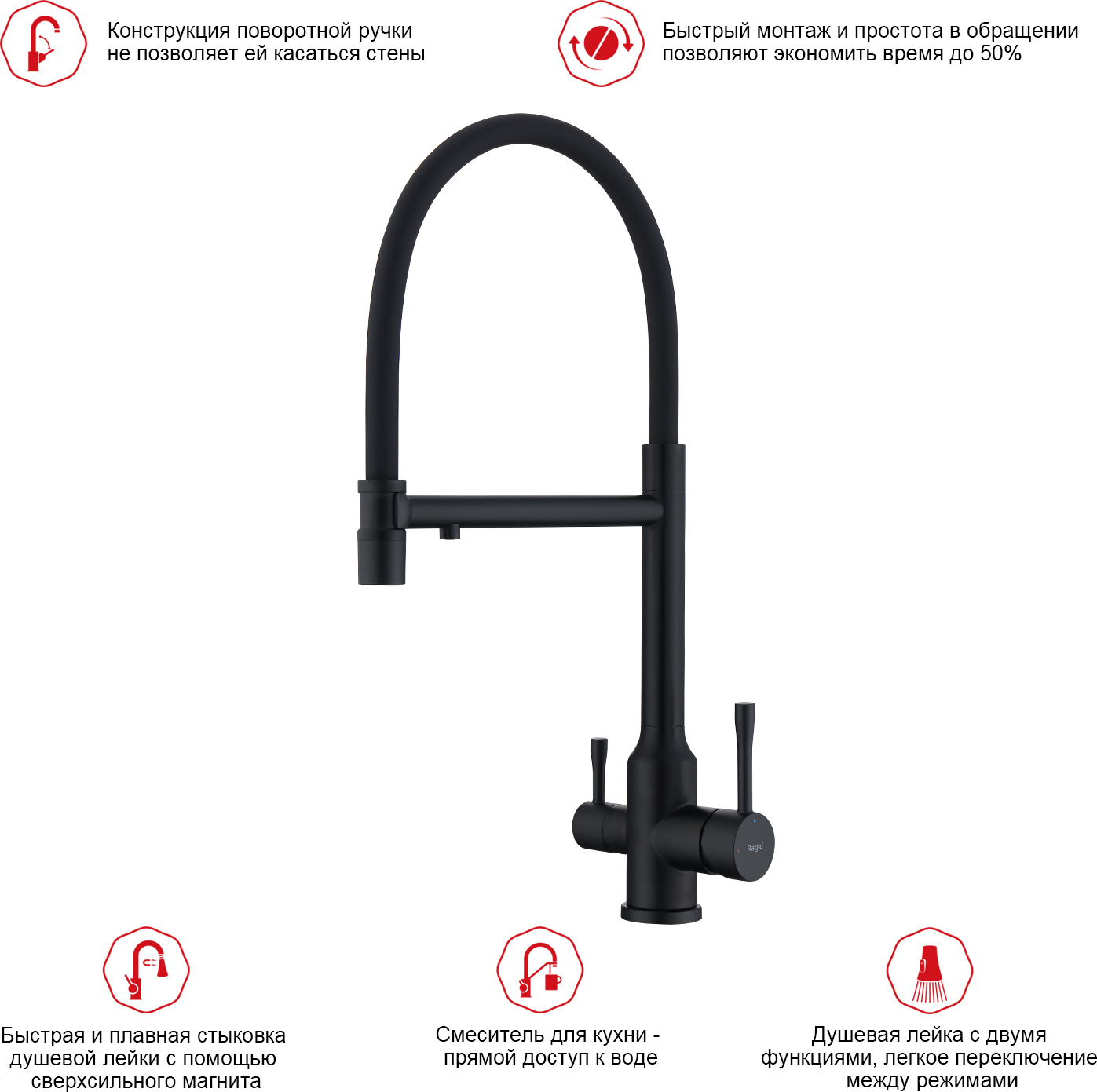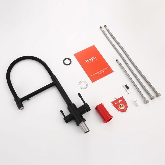 Смеситель для кухни Raglo R81.63.06 с подключением фильтра и гибким изливом, материал нержавеющая сталь, цвет чёрный.