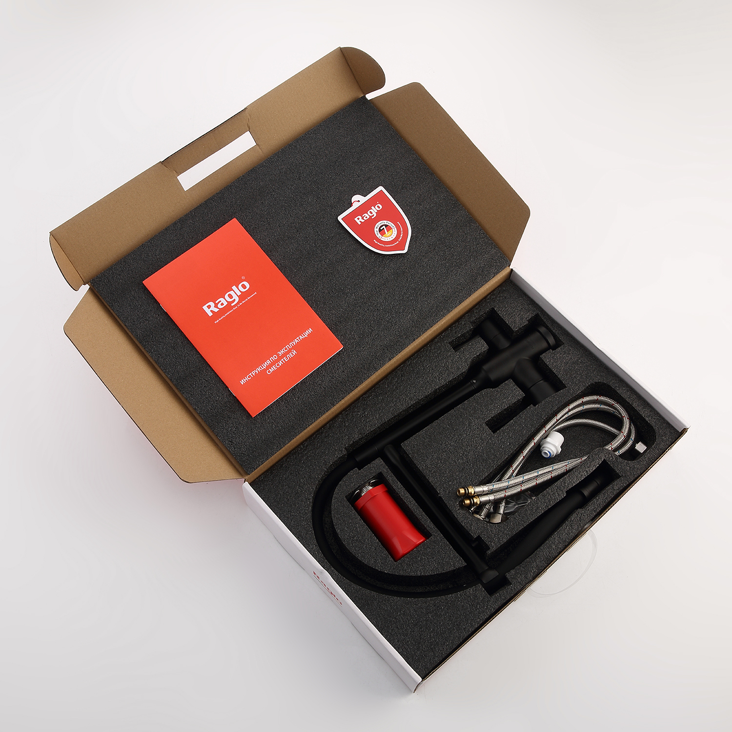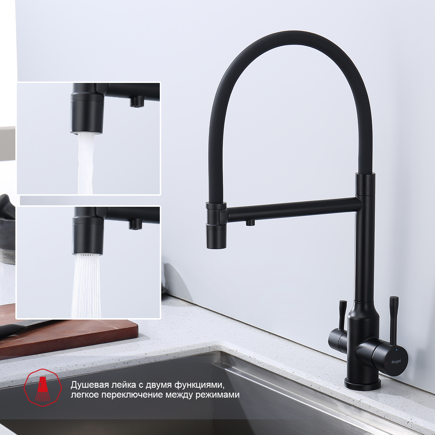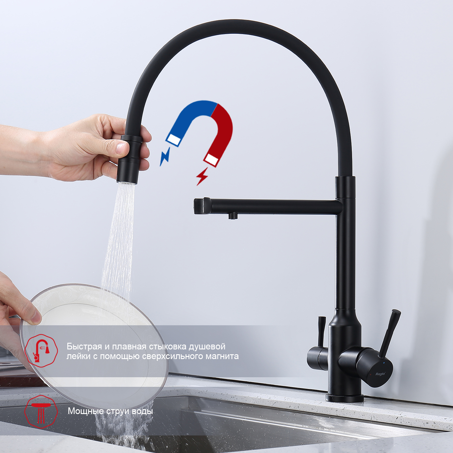 Смеситель для кухни Raglo R81.63.06 с подключением фильтра и гибким изливом, материал нержавеющая сталь, цвет чёрный.